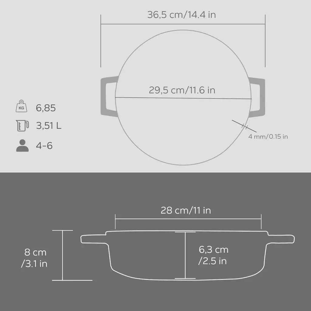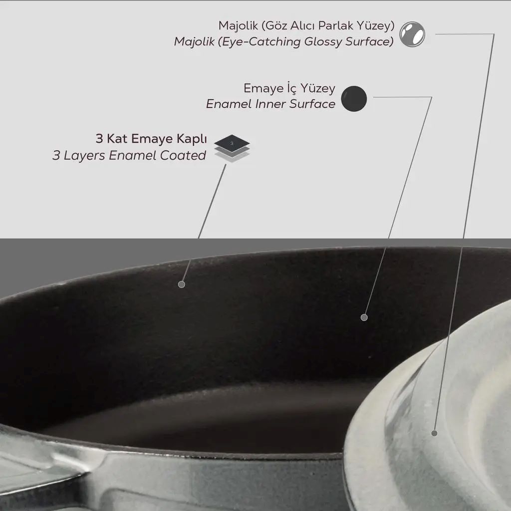 A serpenyő falának vastagsága 4 mm. A termék belsejében egy réteg fekete zománc van bevonva, amely elősegíti a tapadásmentes felület kialakulását zsíros főzés során.