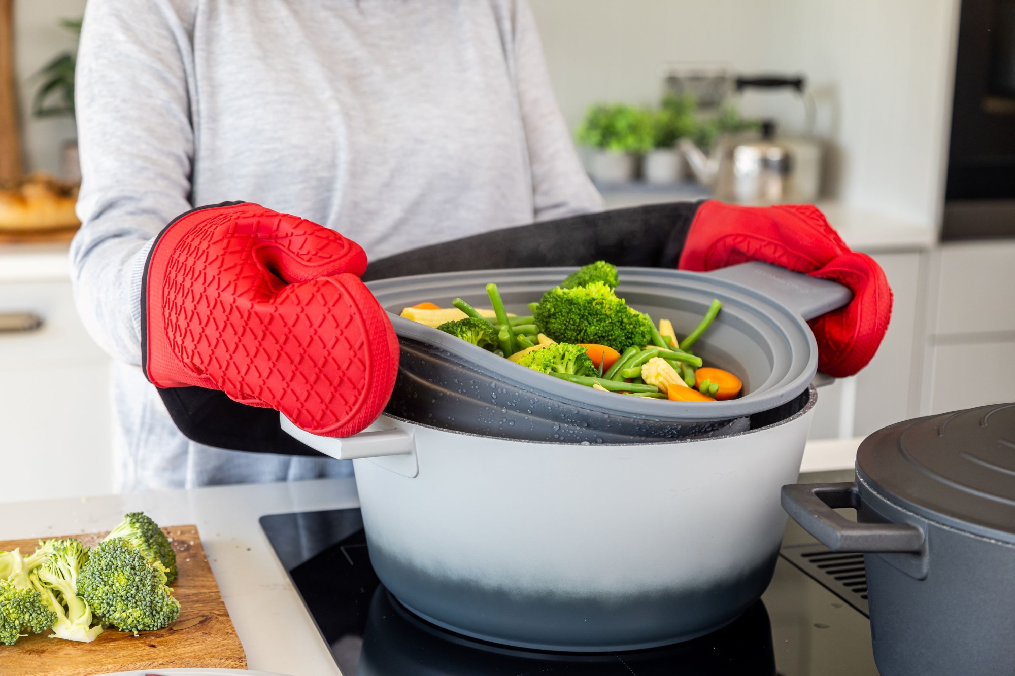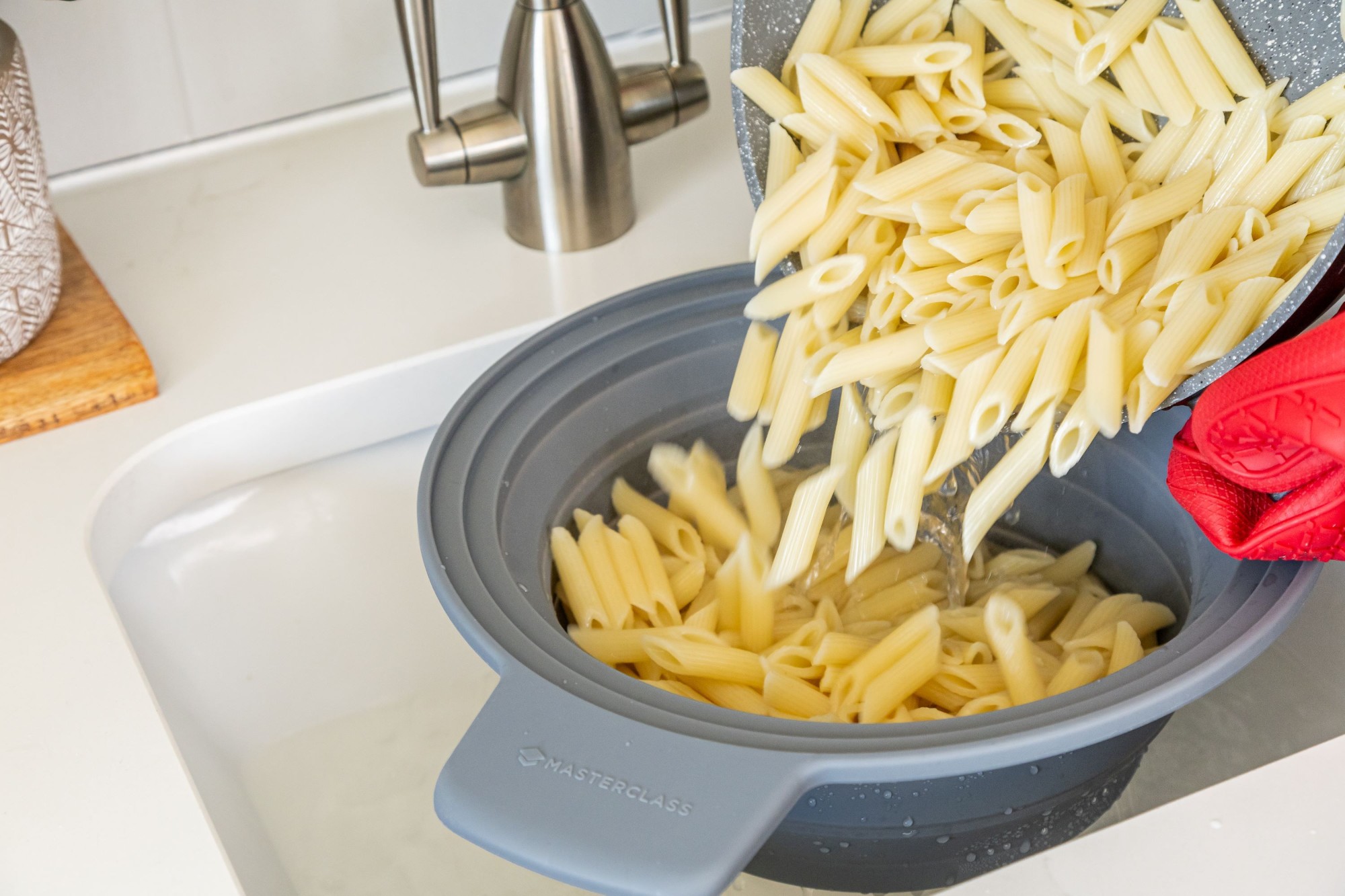2 az 1-ben szűrő és párolókosár, szilikonból, MasterClass, gyártja, méretei 39 x 29 cm.