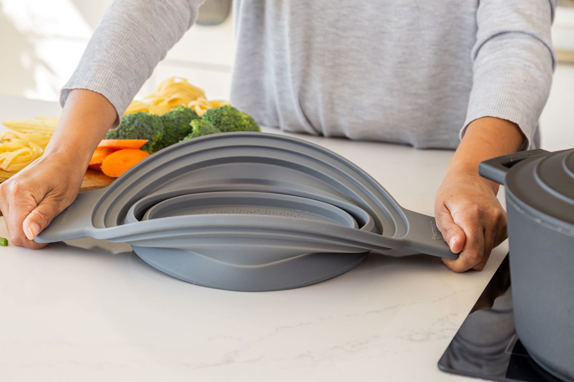 A többfunkciós összecsukható ételszűrőt a kényelem és a helytakarékos hatékonyság érdekében tervezték.