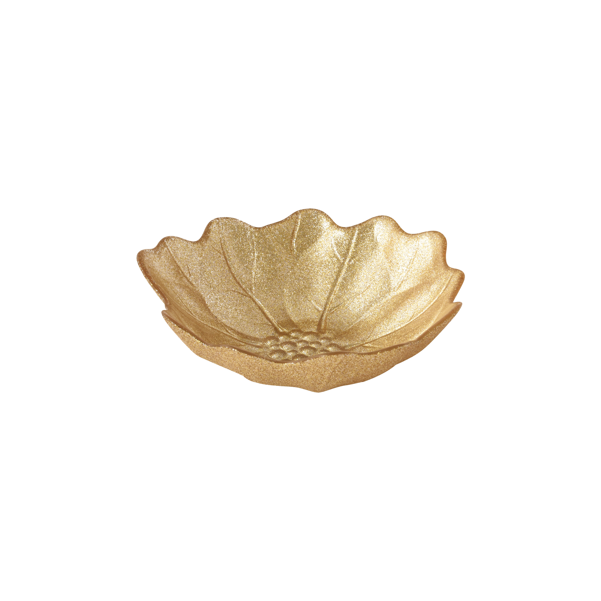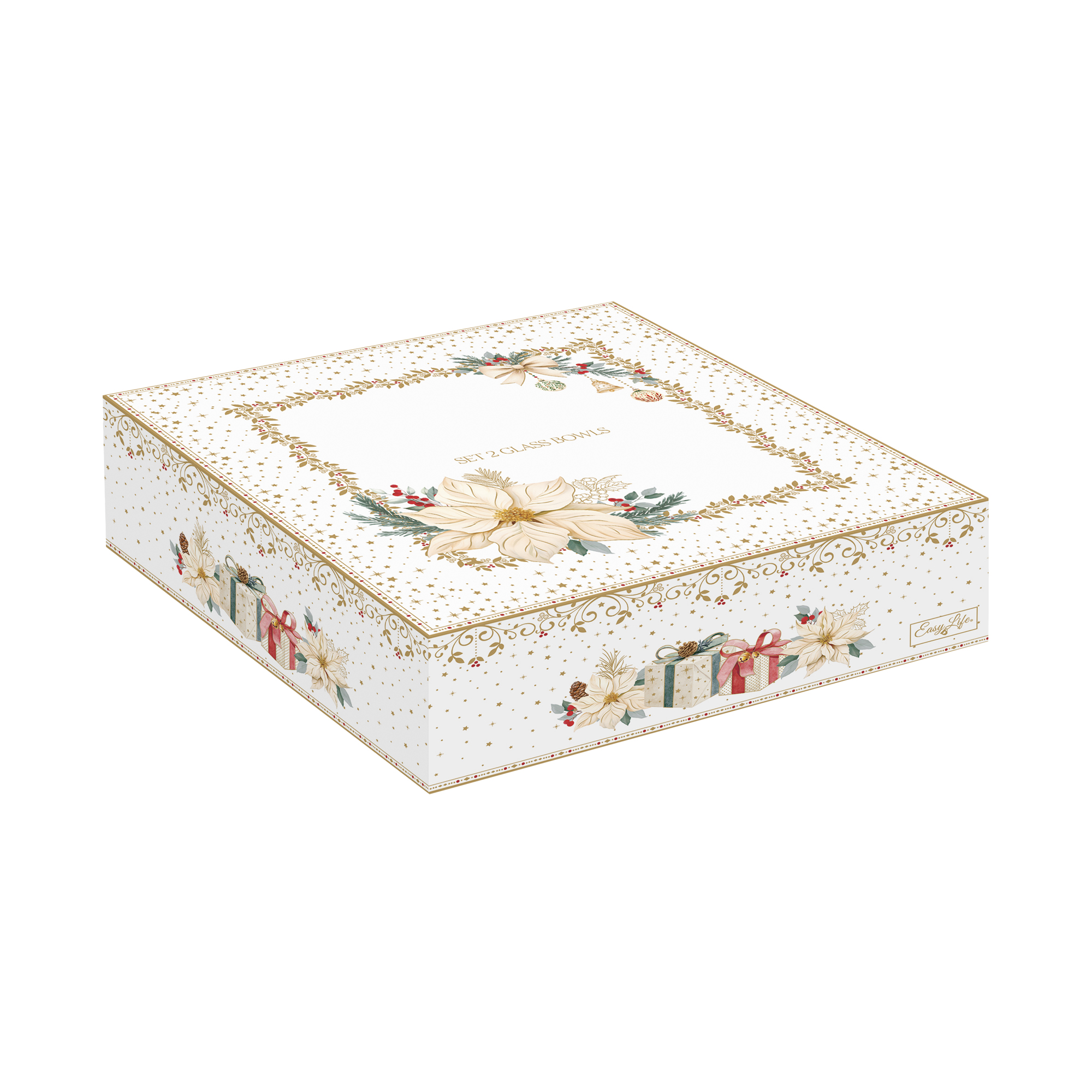 A különböző átmérőjű, Nuova R2S márkájú, arany üvegtálak formája és gondos díszítése a szimbolikus karácsonyi virágot ábrázolja, így igazán elegánsak és csillogást visznek az ünnepi asztalra. A tálak kombinálhatók a White Elegance kollekció vagy más Nuova R2S ünnepi kollekciók más edényeivel.