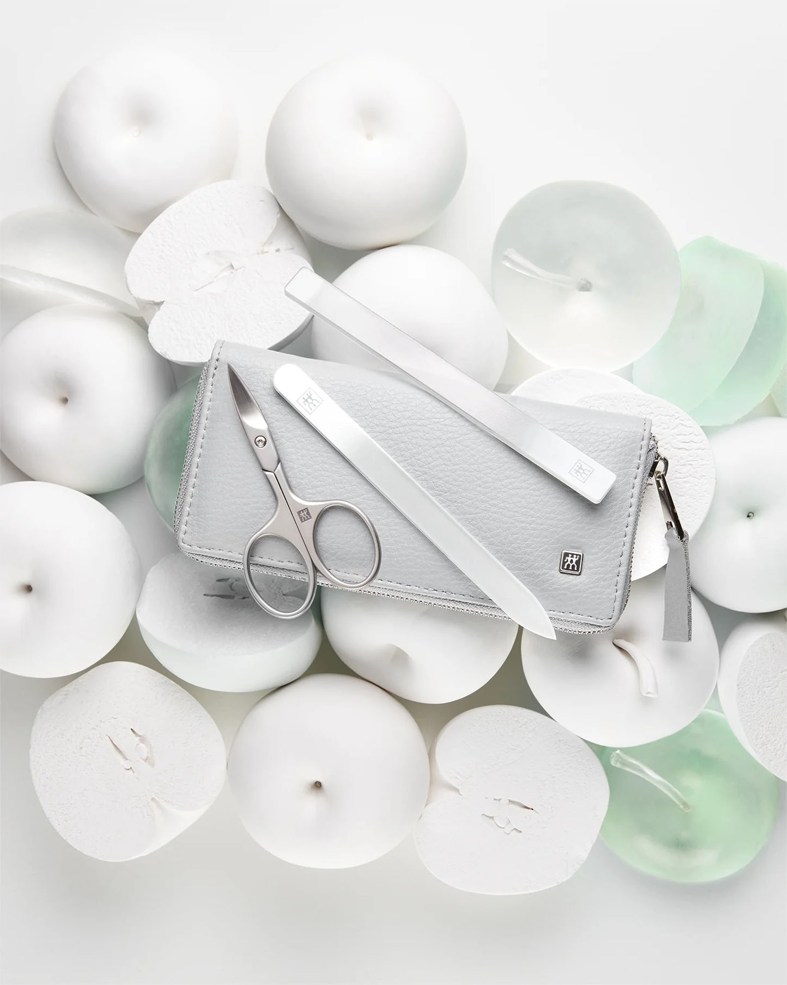 A Zwilling által gyártott 5 darabos manikűrkészlet, szatén bevonatú rozsdamentes acélból és üvegből.