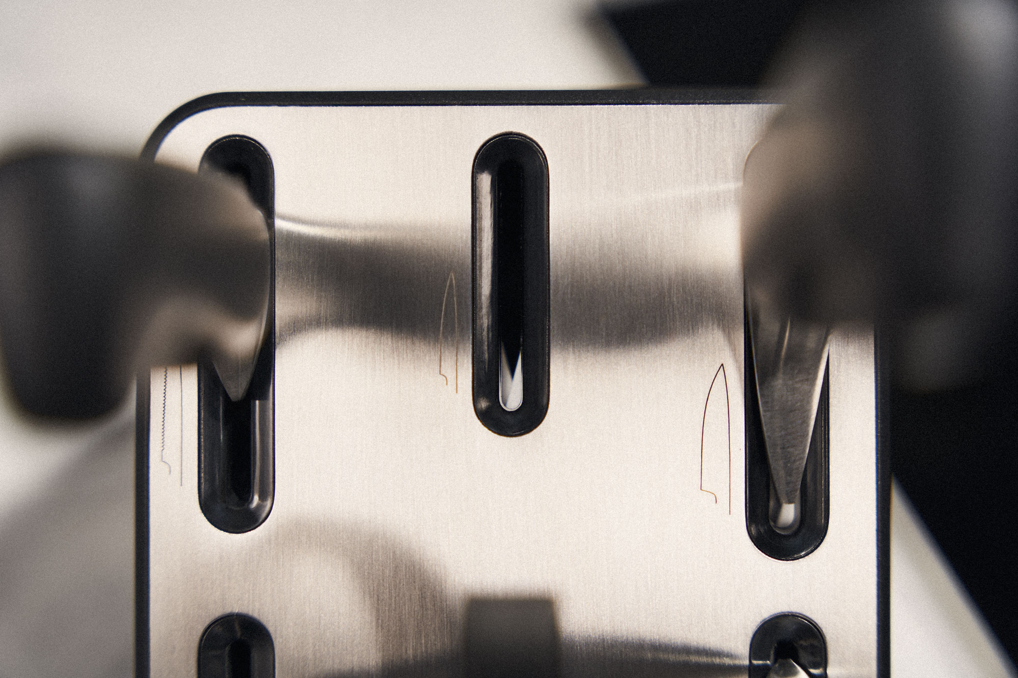 A sima pengéjű kések nyílásai 2 kerámia fenőkövet tartalmaznak, amelyek szögben vannak elrendezve az ideális élezés biztosítása érdekében. A tartóba helyezve vagy onnan eltávolítva a pengék a kerámia kövek közé csúsznak, finoman élezve azokat. Annak érdekében, hogy a kések véletlenül ne kerüljenek a rossz nyílásba, a tartón az egyes késtípusokhoz tartozó nyílások mellett ikonok találhatók.