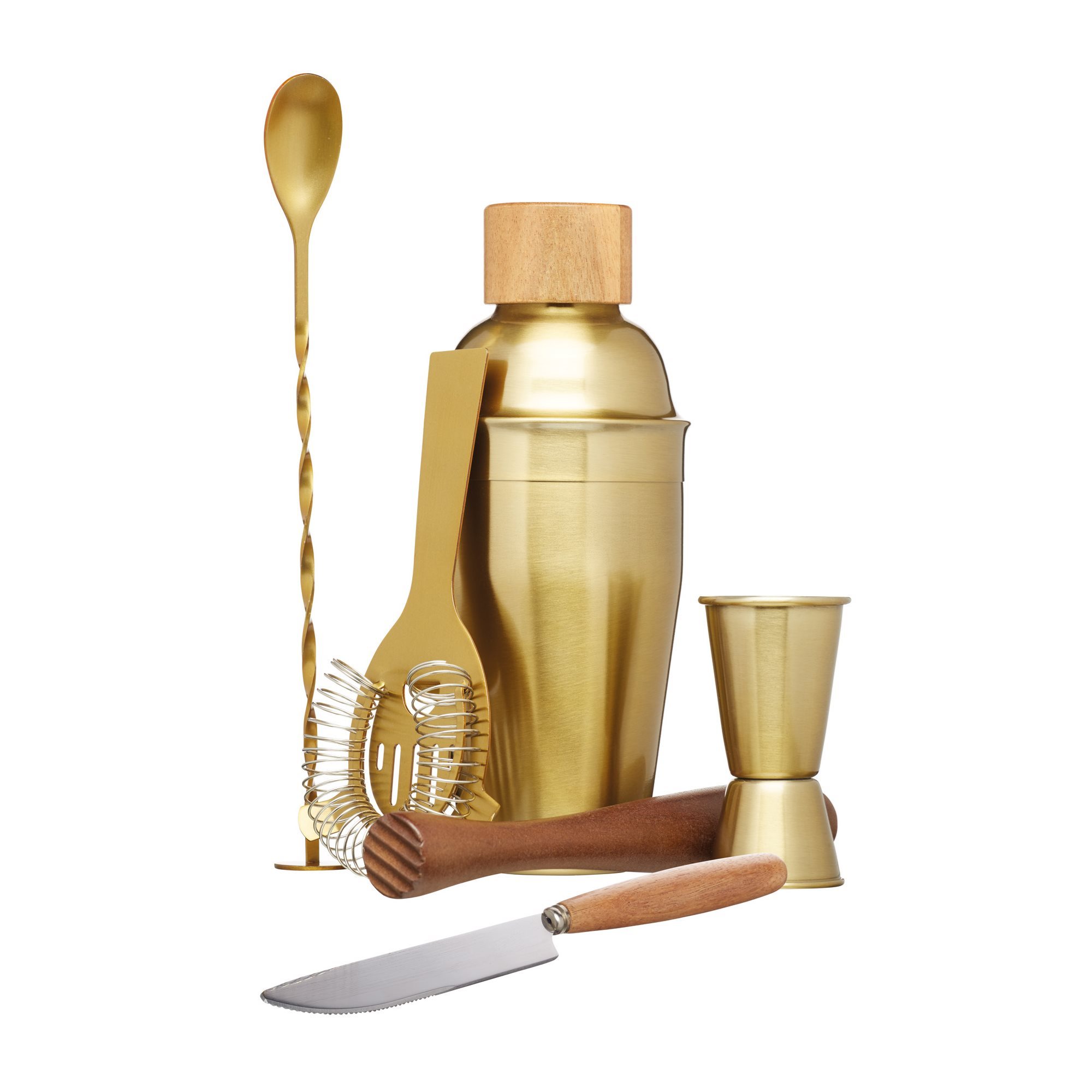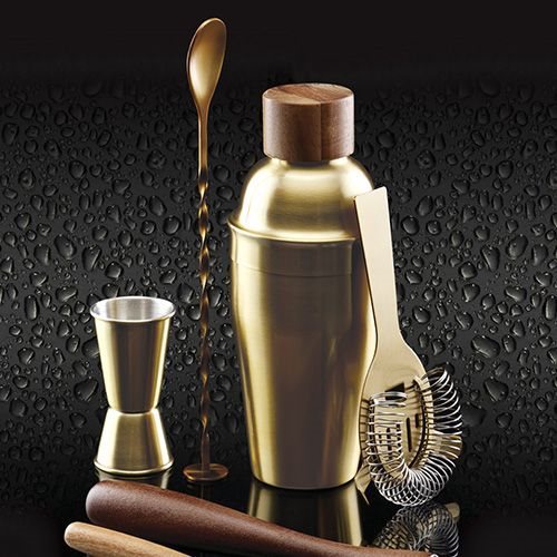 - 1 db polírozott arany rozsdamentes acélból készült koktélshaker, fa kupakkal;
