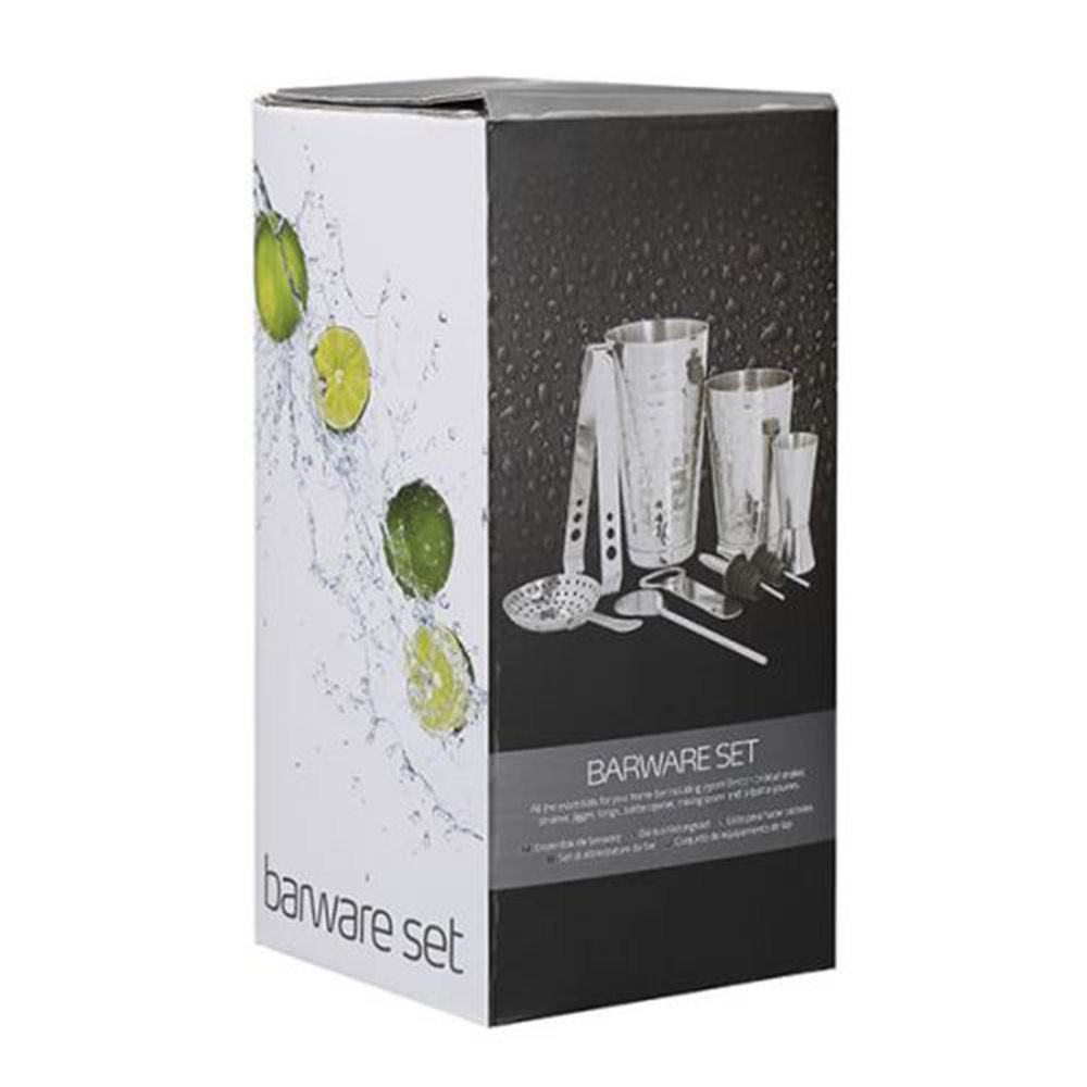 A készlet tartalmaz egy 750 ml-es Boston-stílusú koktélshakert (a profi mixológusok kedvenc választása) és egy komplett báreszköz-készletet: egy dupla mérőpoharat (25/50 ml), egy üvegnyitót, egy keverőkanálat, jégcsipeszt, egy szűrőt és két szilikon tömítéssel ellátott kiöntőt.