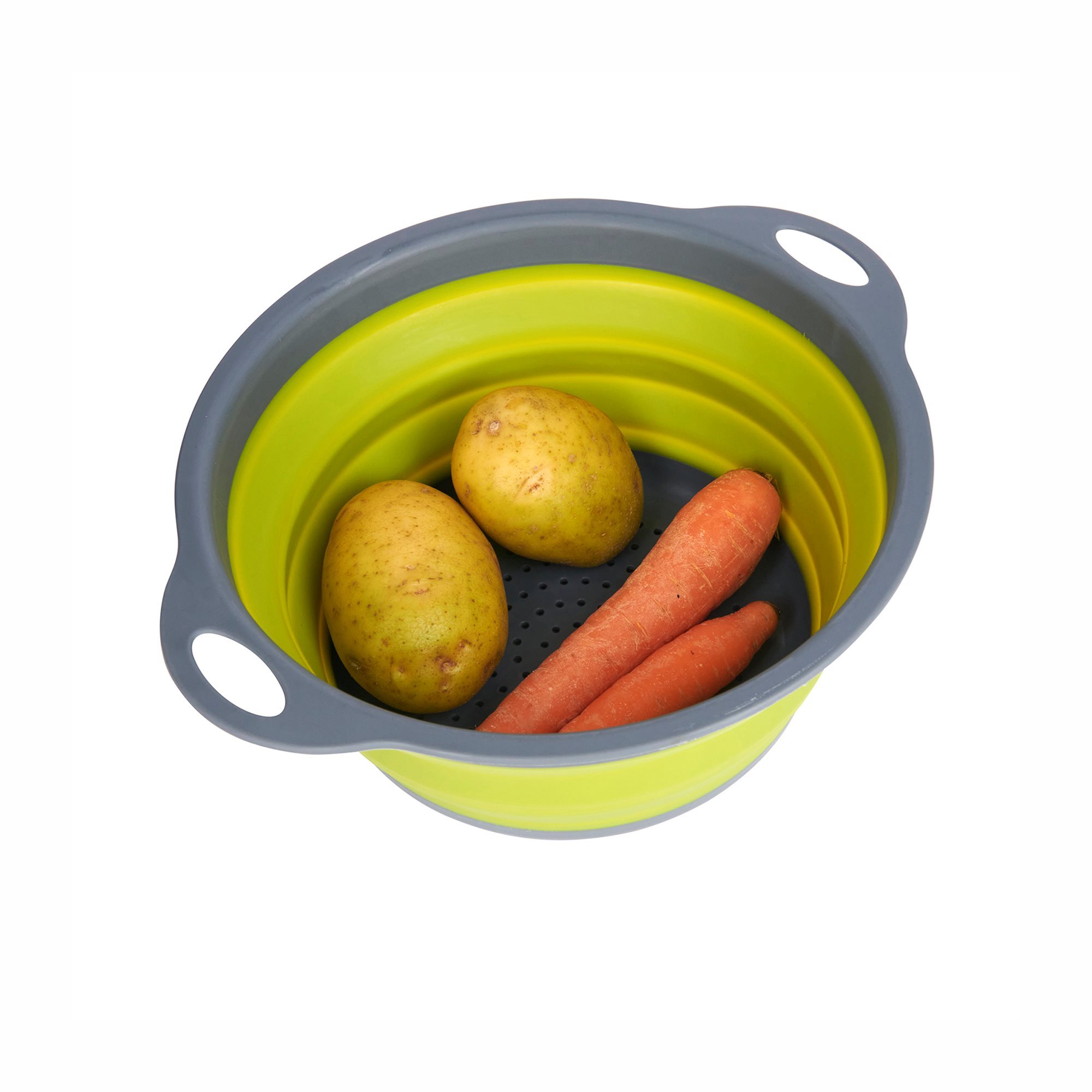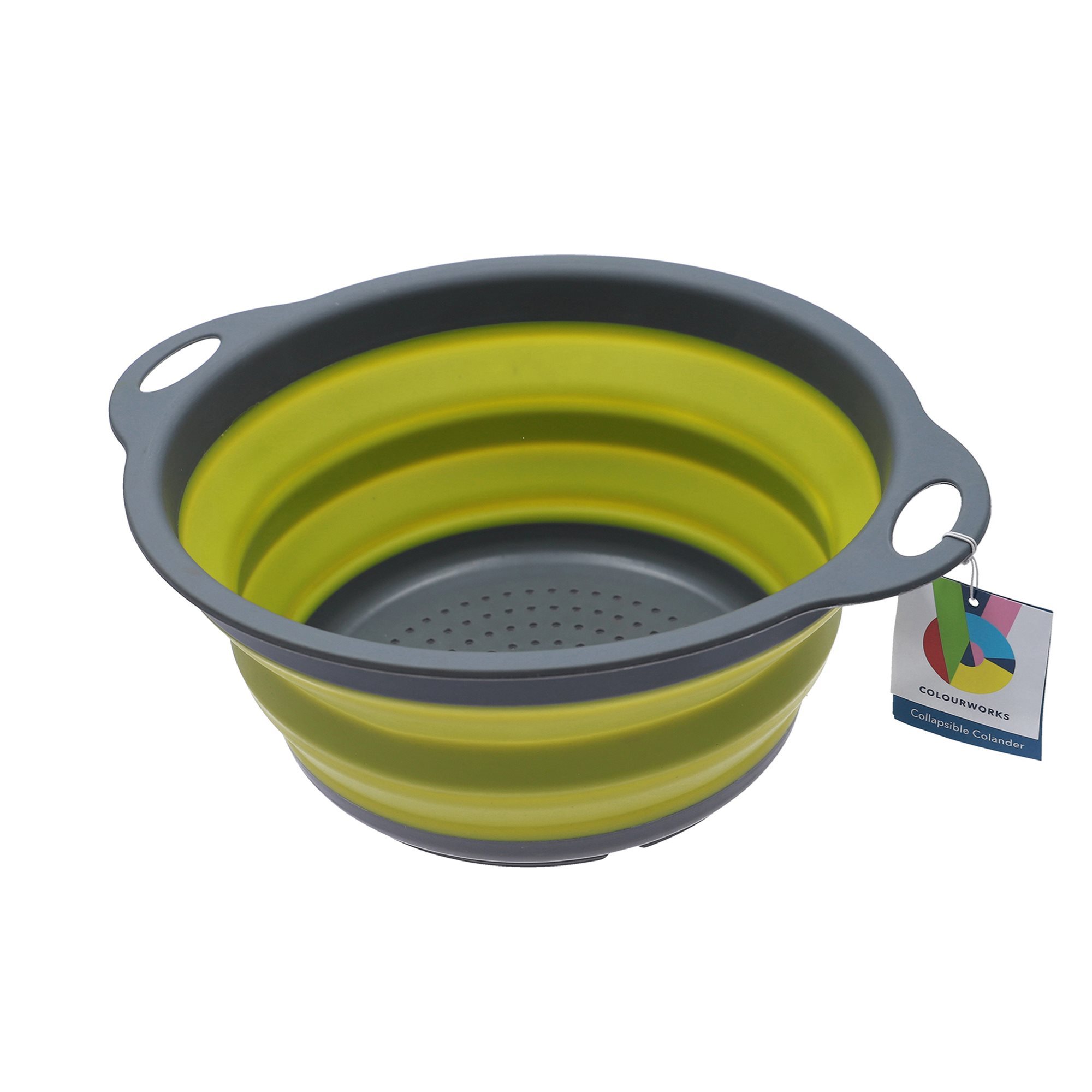 Colourworks összecsukható szűrőedény, átmérője 24 cm, zöld hőálló szilikonból, fogantyúkkal és szürke szitával.