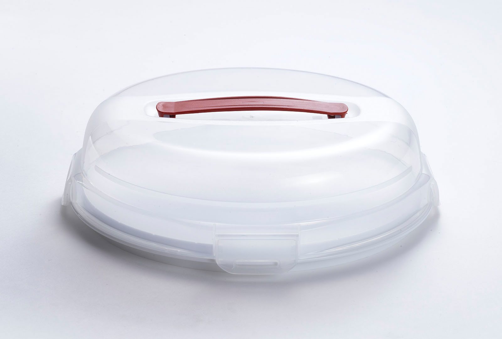 Kerek formájú tároló, anyaga műanyag, fedővel ellátva, zárófüllel, Curver márkájú, kiválóan alkalmas torták, sütemények vagy muffinok tárolására és szállítására.