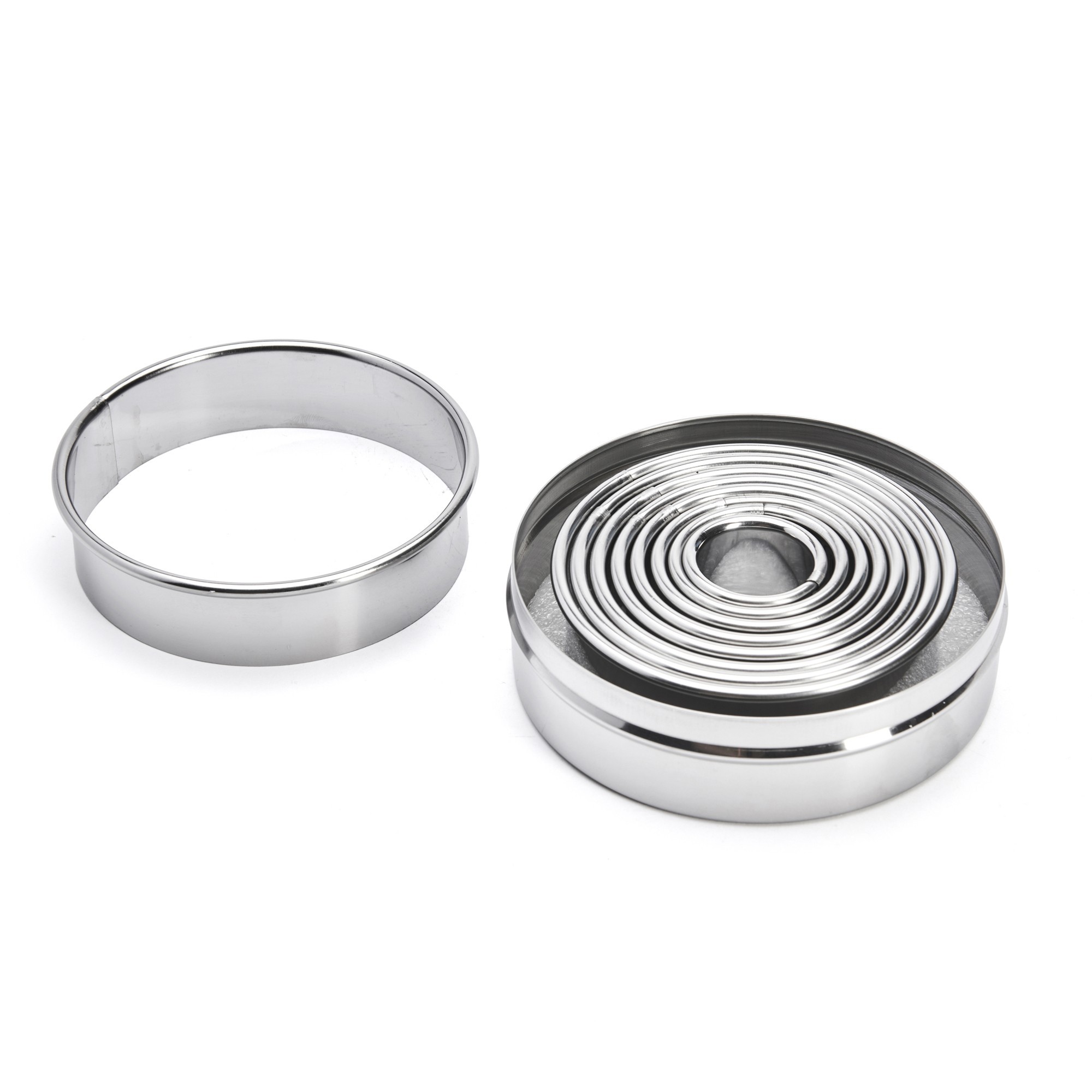 9 darabos de Buyer süteménykivágó, anyaga rozsdamentes acél nagyon tartósak, megtartják formájukat hosszú használat ellenére is, különböző átmérővel: 3 cm és 11 cm között, magasságuk 3,5 cm, piték vagy egyéb sütemények alapjának elkészítéséhez használható.