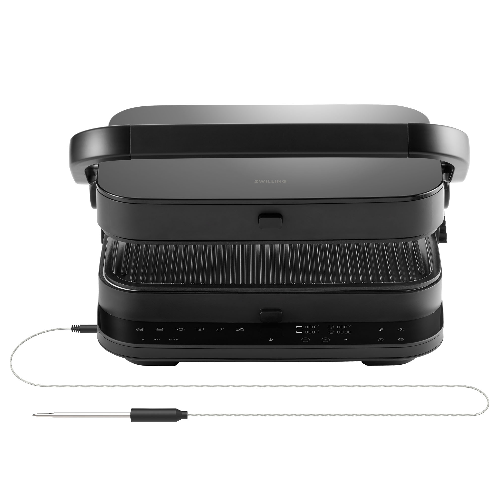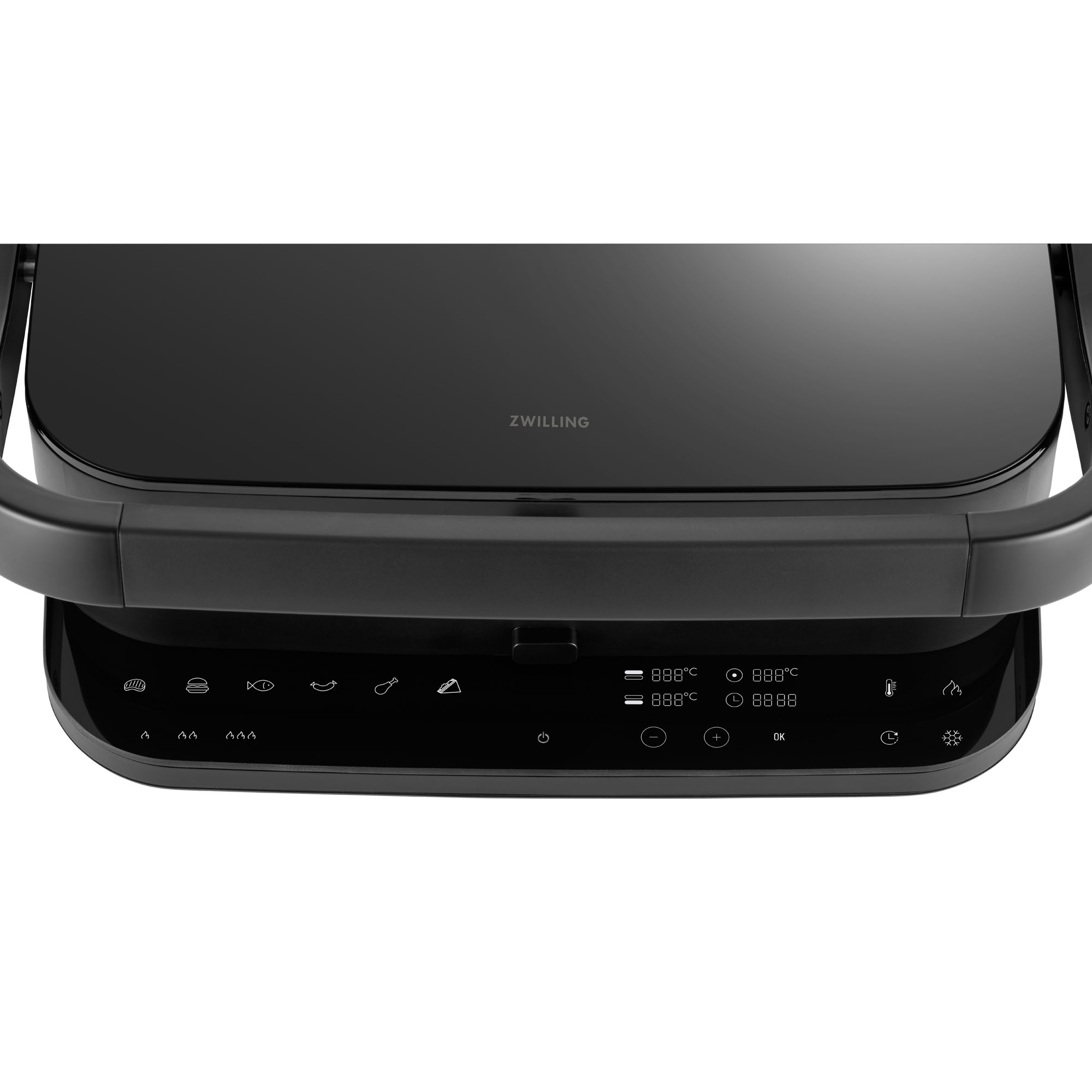 A Zwilling által gyártott , 1850 W teljesítményű 2 az 1-ben "Enfinigy" elektromos grill modern dizájnnal és kerámia bevonatú lapokkal rendelkezik, amelyek biztosítják az egyenletes főzést.