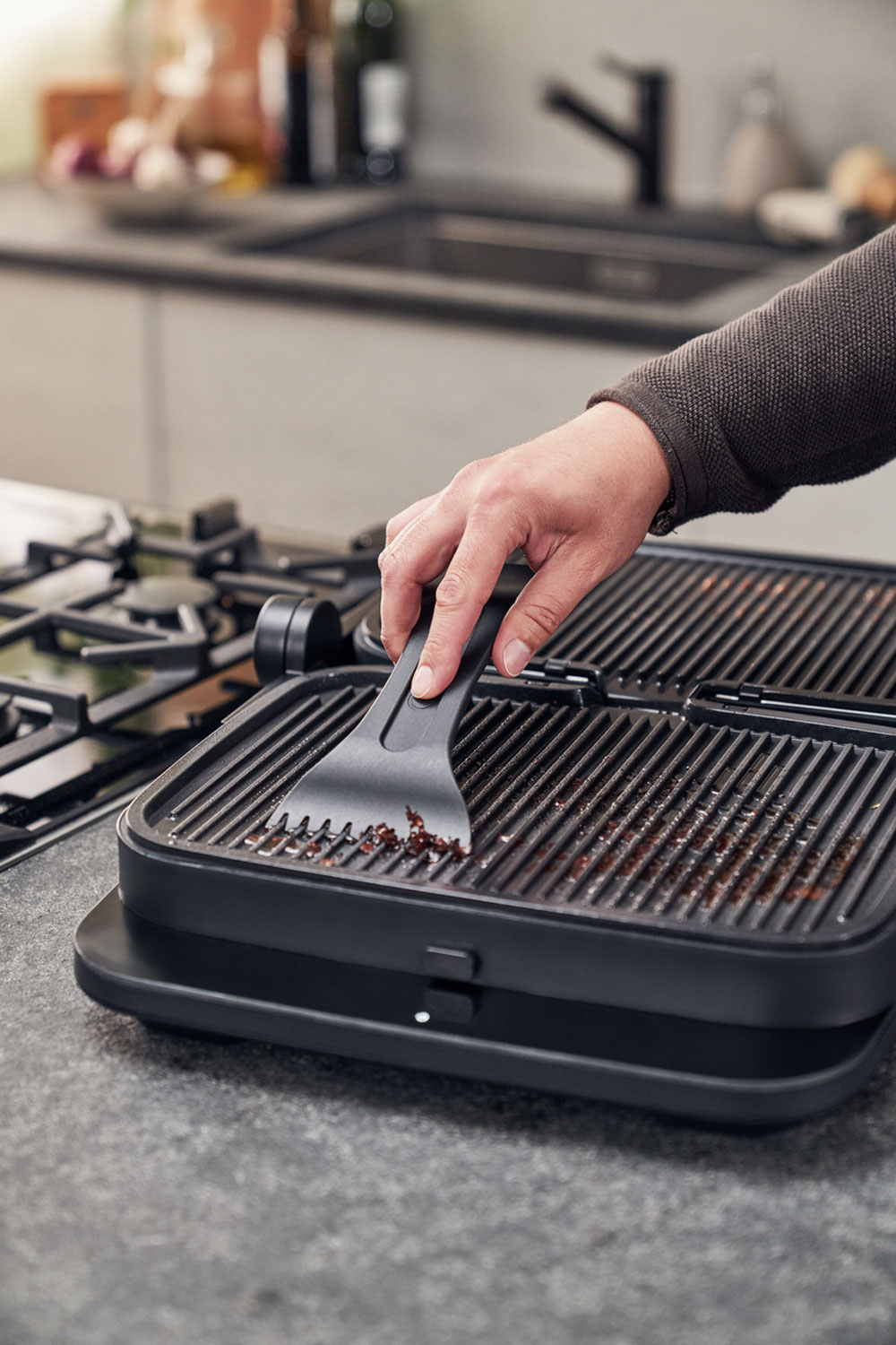 A 2 az 1-ben funkció lehetővé teszi, hogy zárt (kontaktrács) vagy 180°-os szögben nyitott állapotban is használható legyen extra nagy grillezési módban.