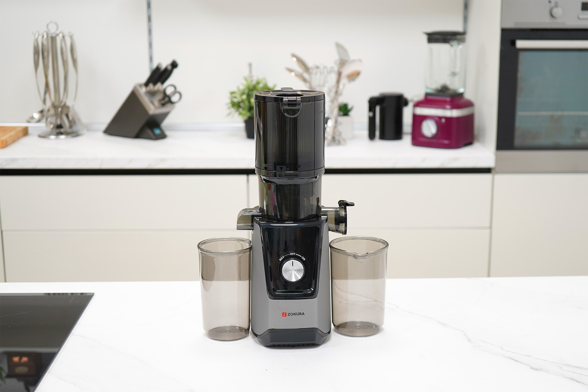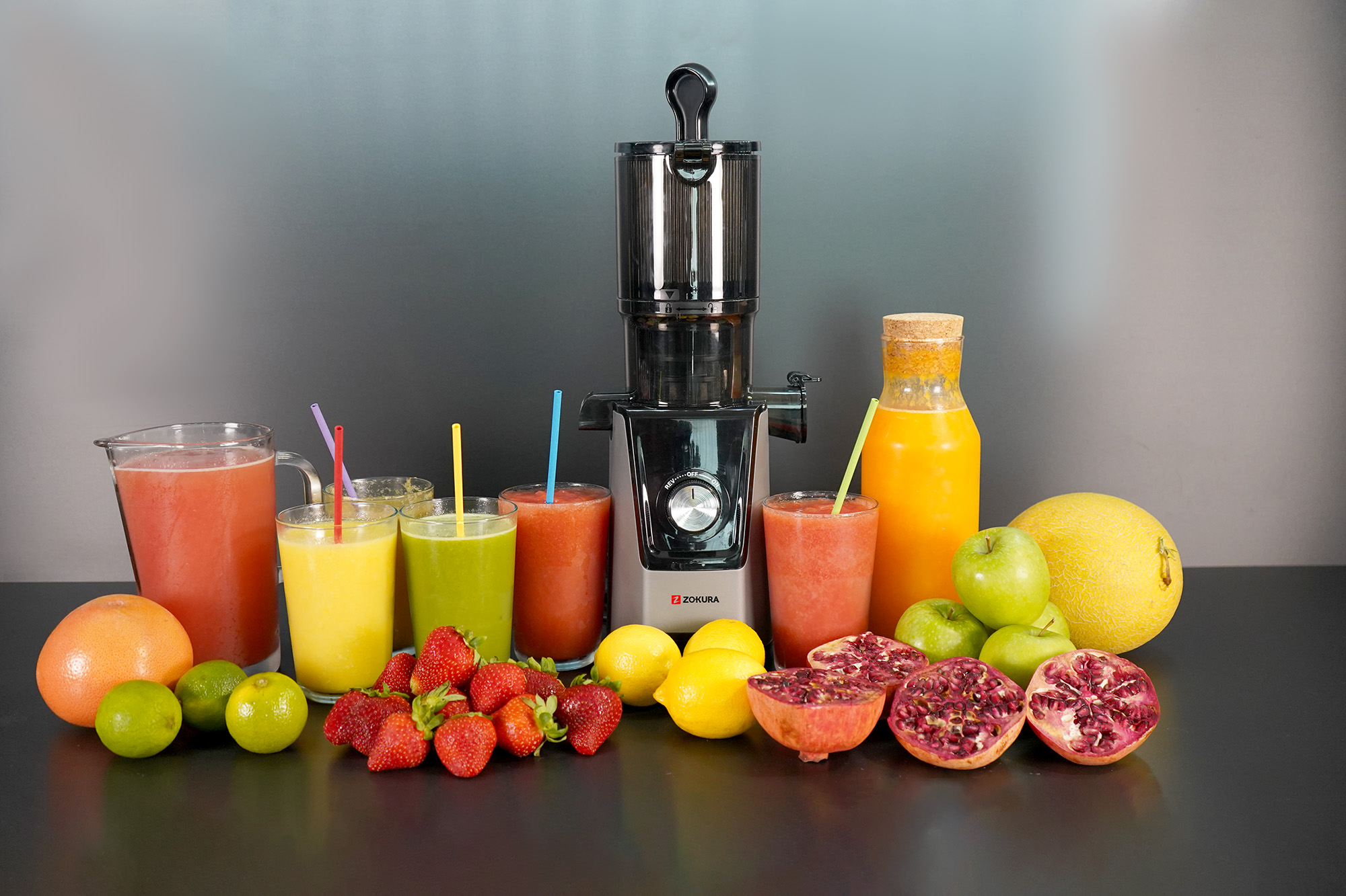 Lassú, hidegen sajtolt elektromos facsaró gyümölcsökhöz és zöldségekhez, széles adagolócsúszdával, a Zokura gyártásával.