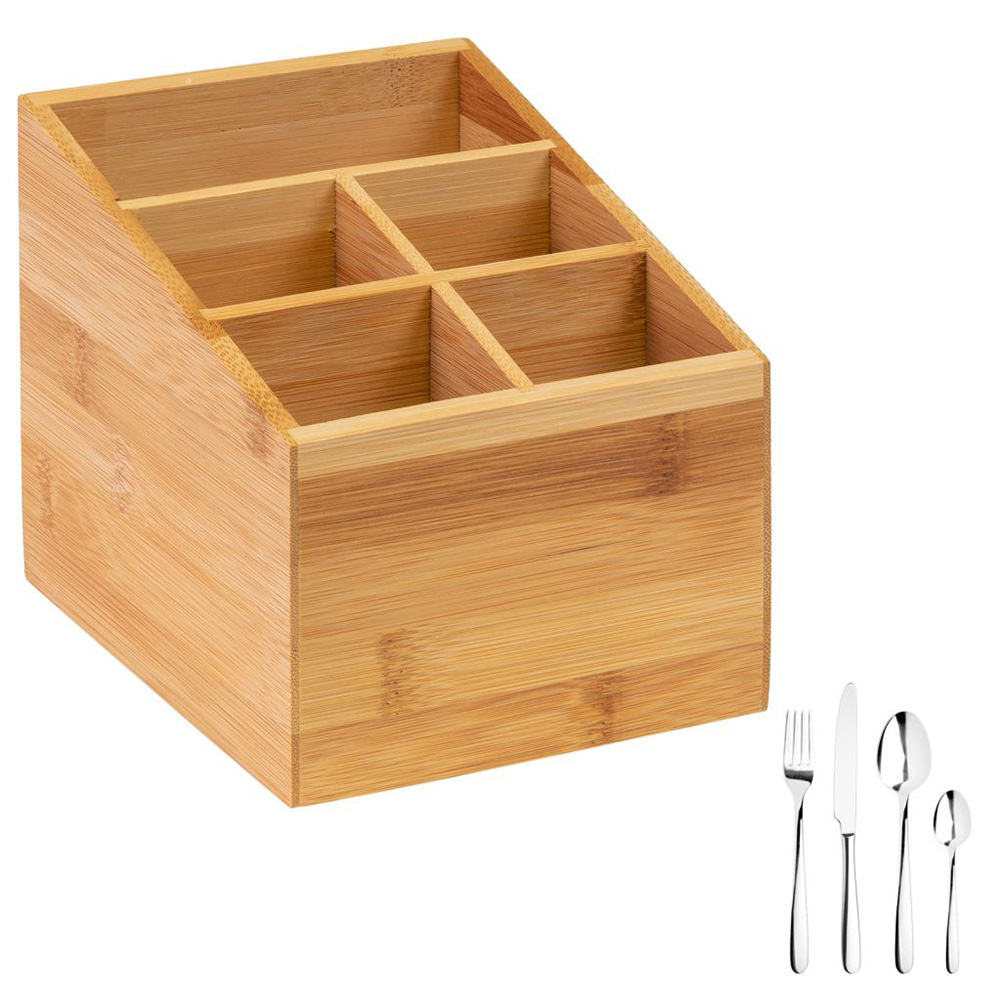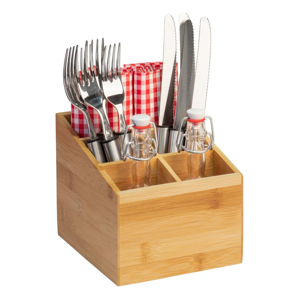 Ez a vonzó bambusz evőeszköz-szervező bármilyen konyhához alkalmas. Tökéletes kiegészítő evőeszközök, fűszerek, szalvéták és sok más tárolására.