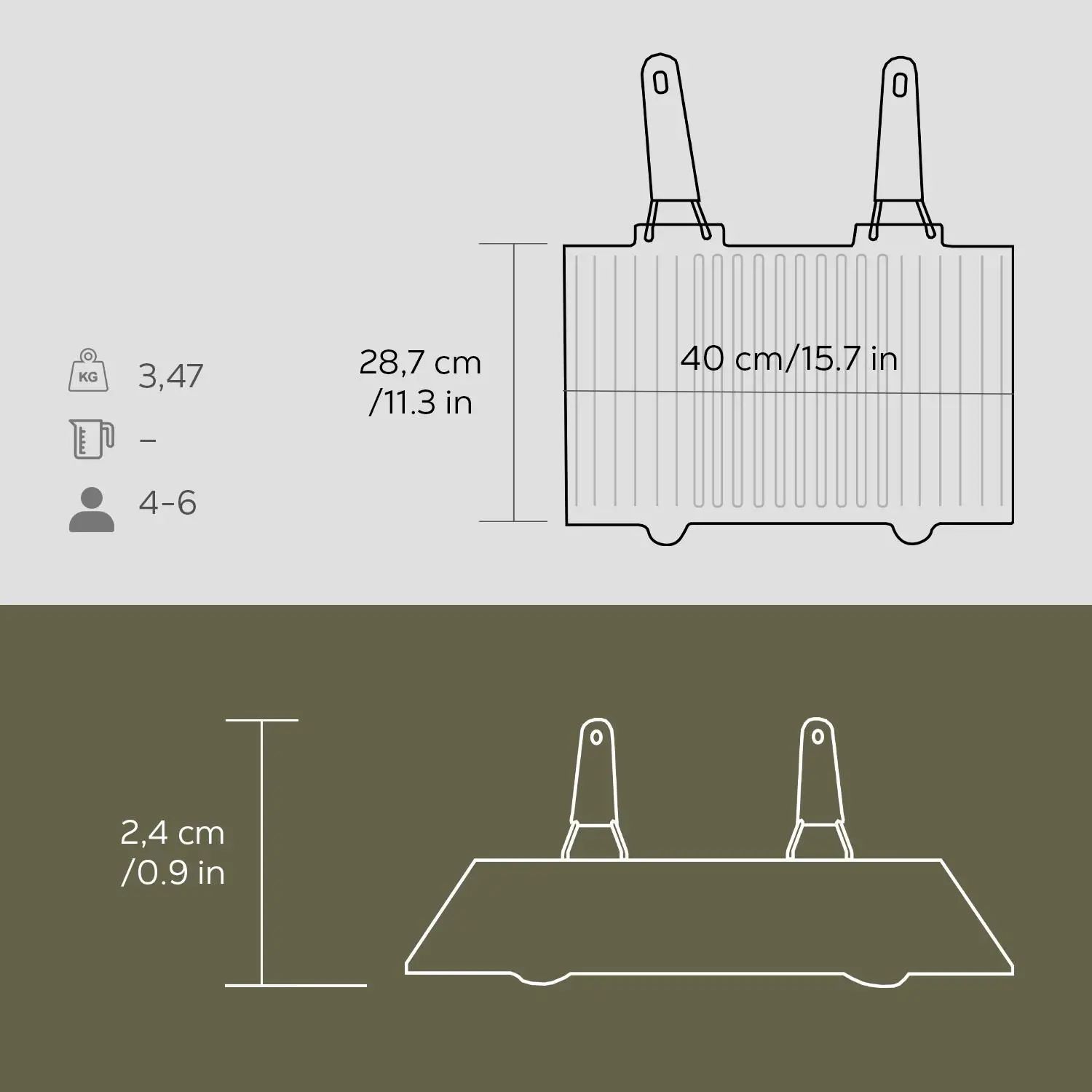 Az öntöttvas grill zománcréteggel van bevonva, és az alapja vastagsága 7 mm. A szilikon bevonatú rozsdamentes acél fogantyúk megvédik a kezét főzés közben, vagy amikor a grillt egyik helyről a másikra mozgatja.