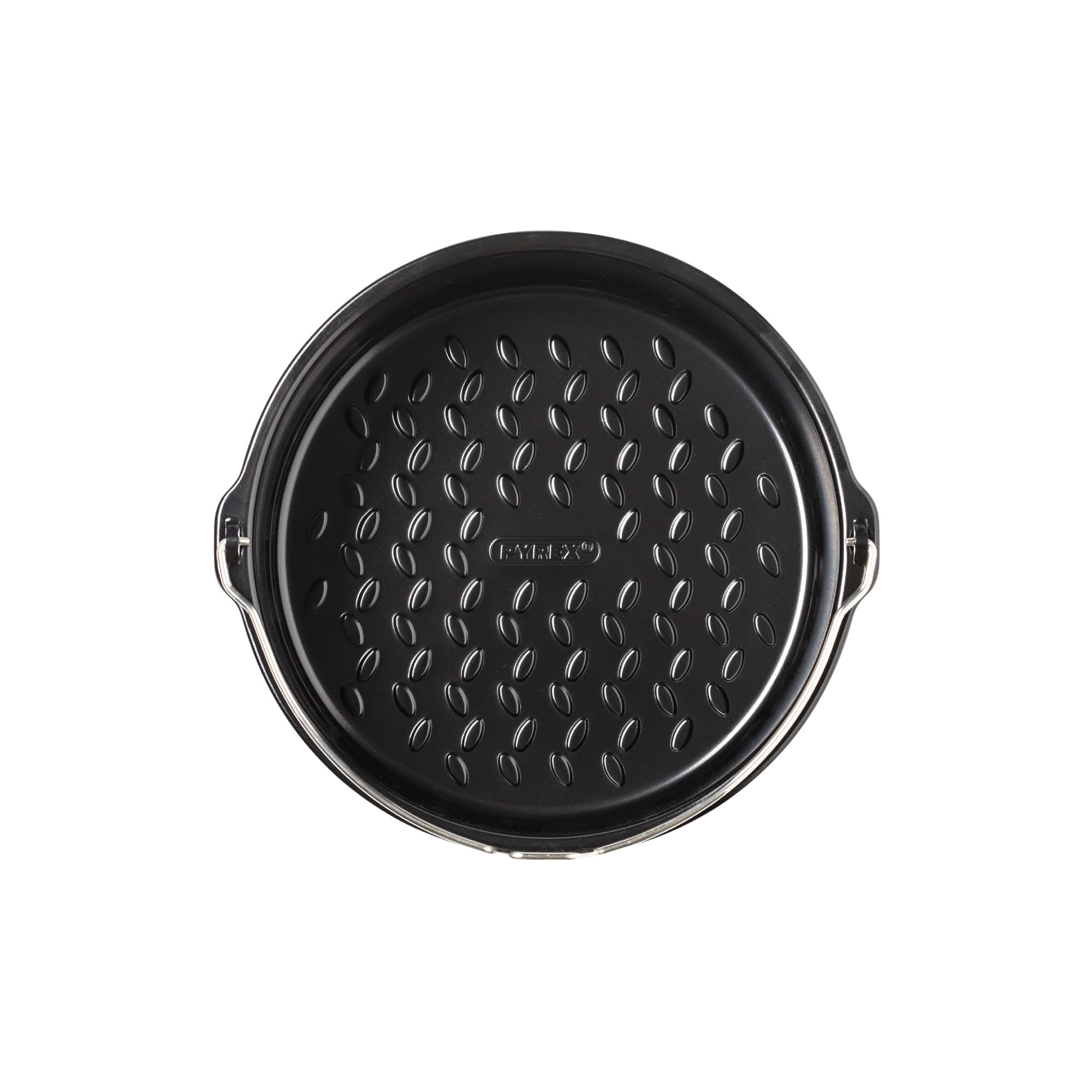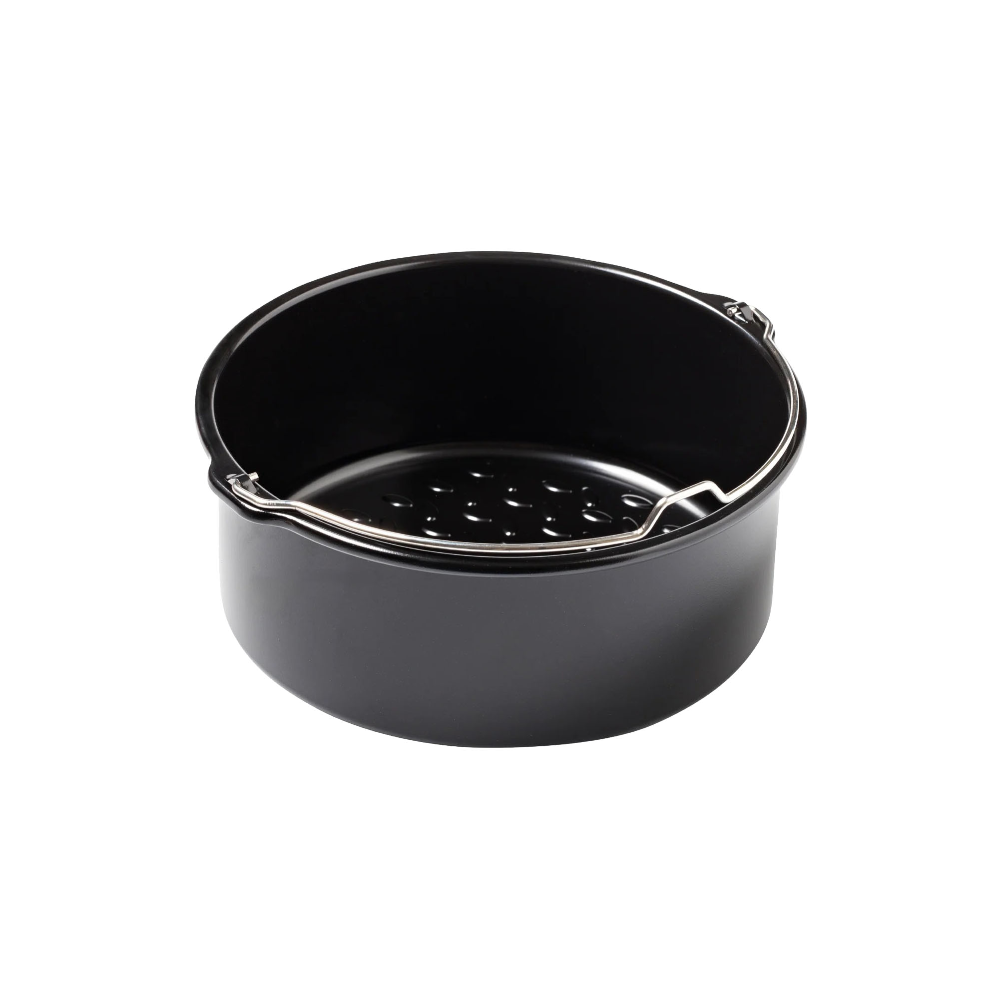 Kerek tartály, alkalmas légsütőhöz, külső átmérője 19 cm, acélból készült, tapadásmentes bevonattal, a Pyrex gyártotta.