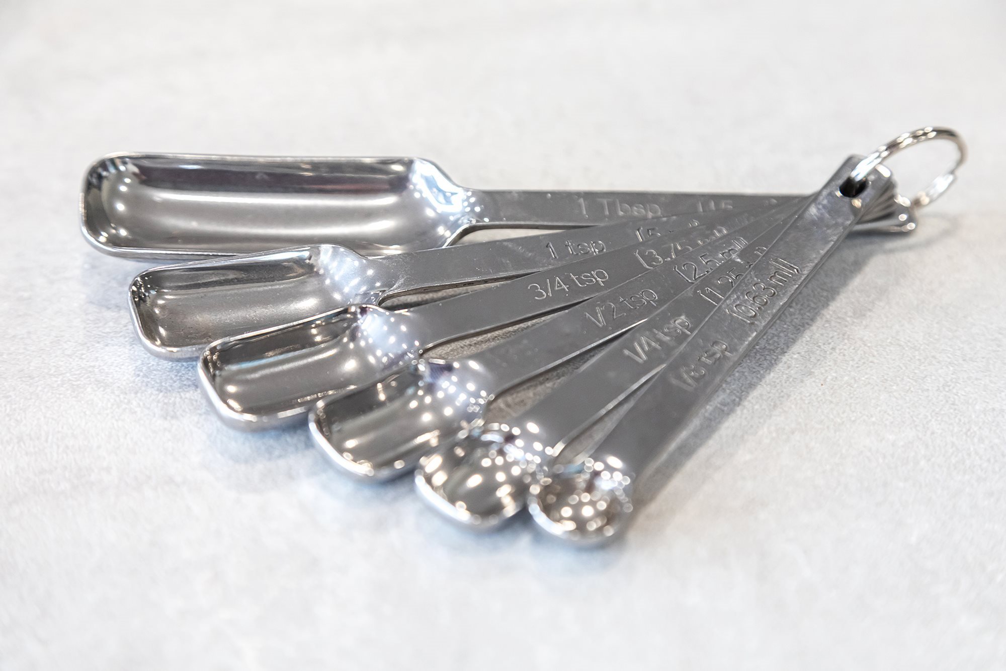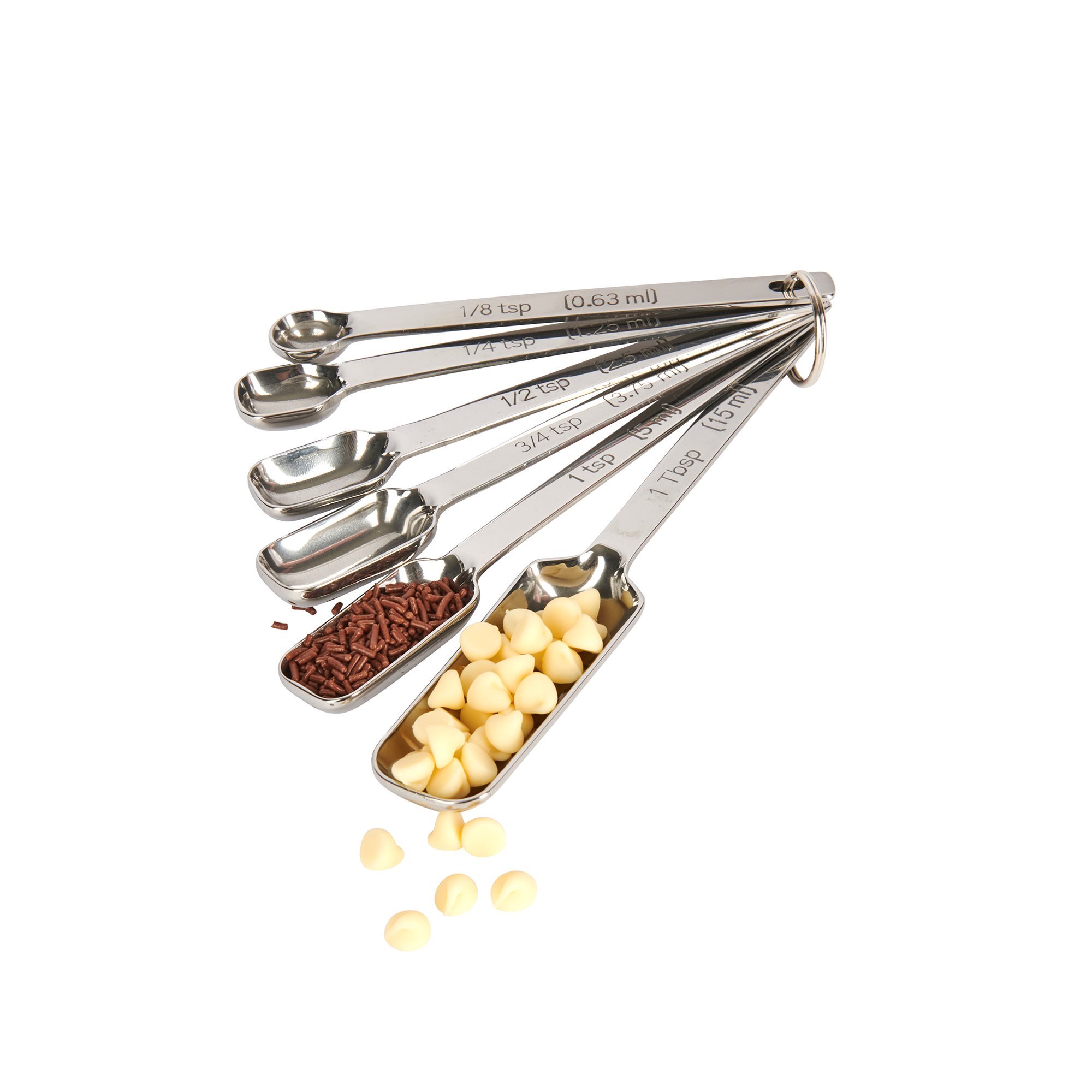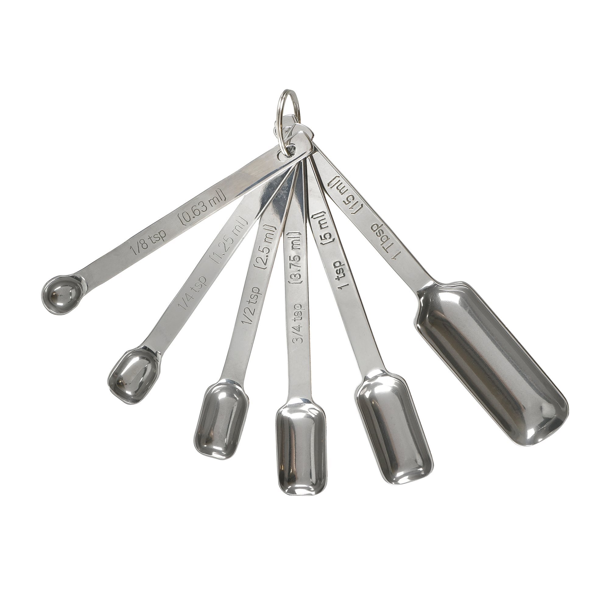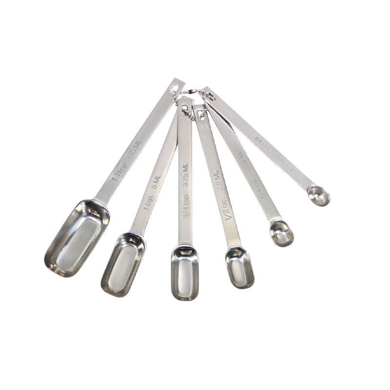 Kitchen Craft rozsdamentes acél mérőkanál készlet. 6 mérőkanalat tartalmaz, tea spoon (tsp), Table spoon (Tbs) és ml mértékegységekkel