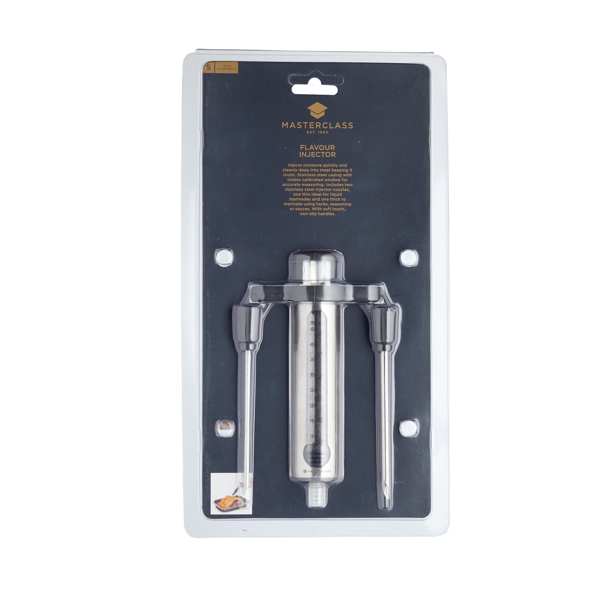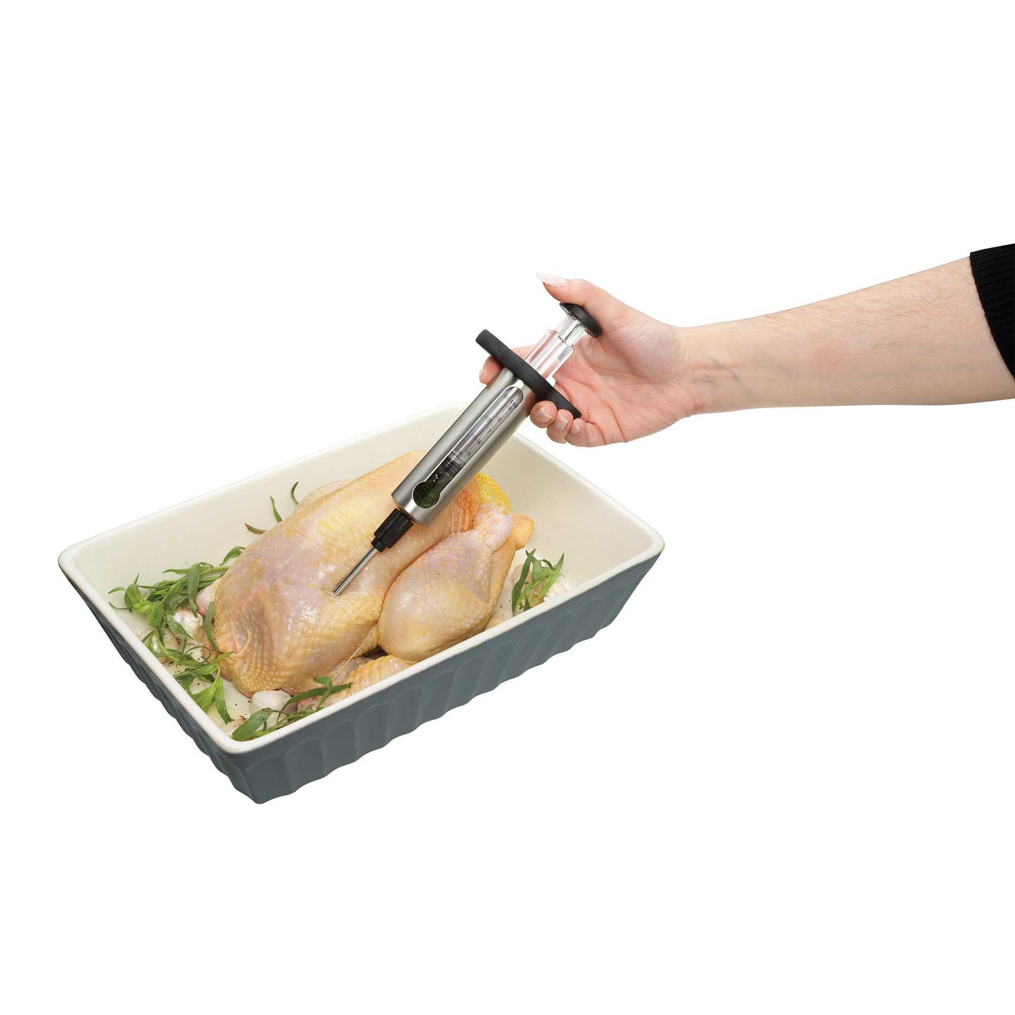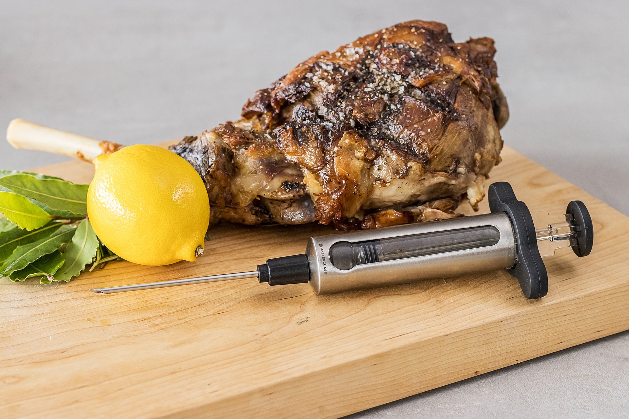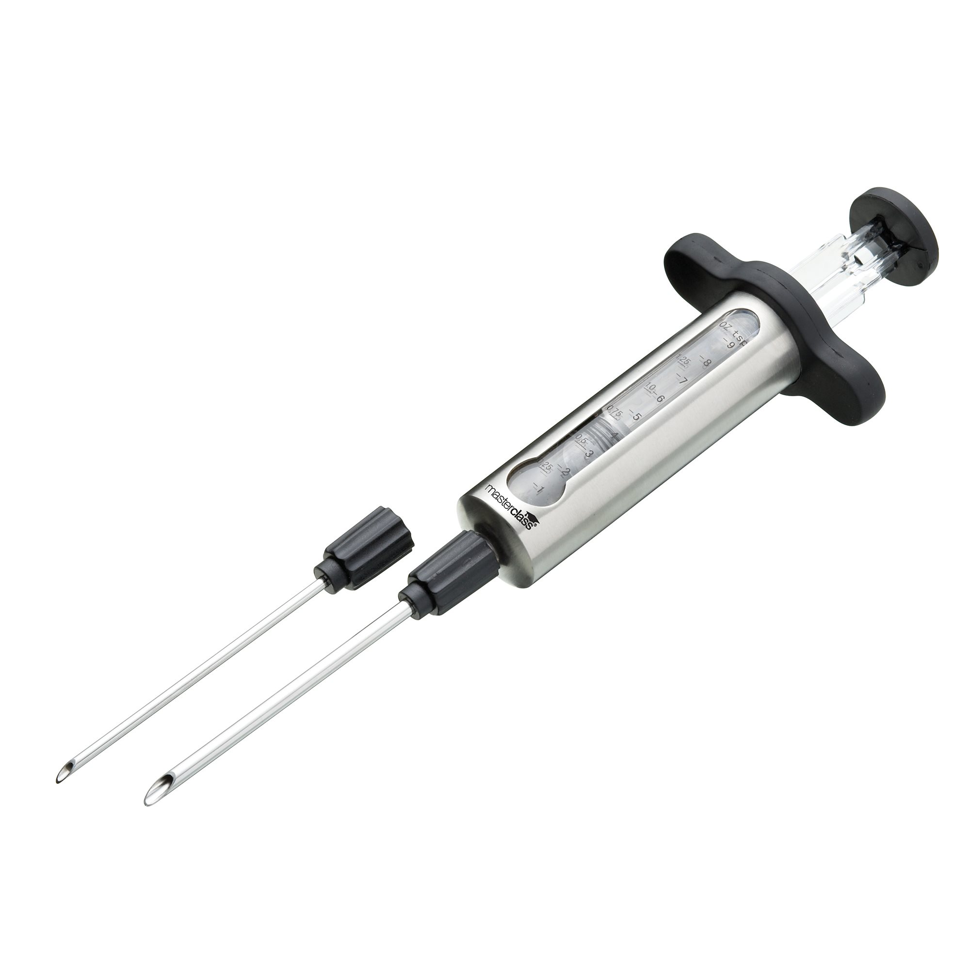 A fecskendő 2 rozsdamentes tűvel van ellátva, az egyik segítségével folyadékok bejuttatására, a vastagabb pedig a fűszeres páclevek bejuttatására.