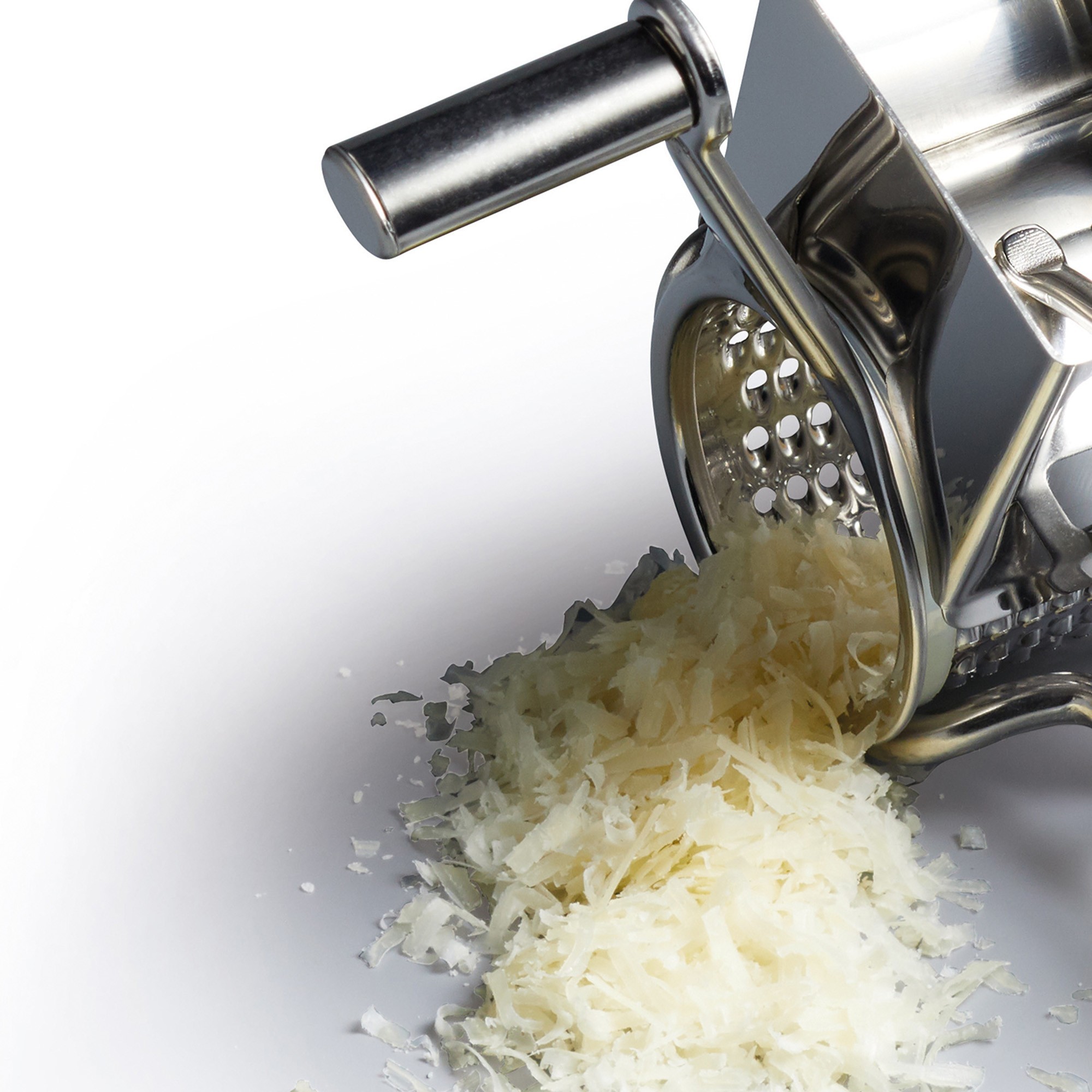 A reszelő forgatókarral és rozsdamentes acél pengékkel rendelkezik, amelyek kemény sajtok, csokoládé, dió és még szárított kókusz reszelésére is alkalmasak.