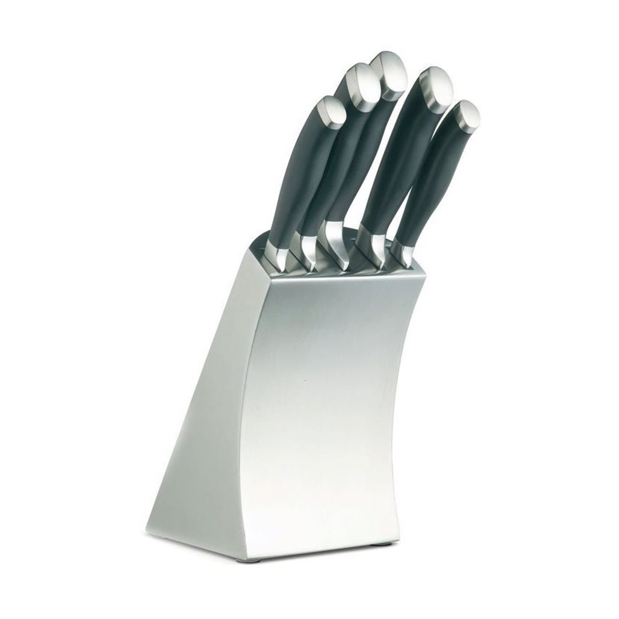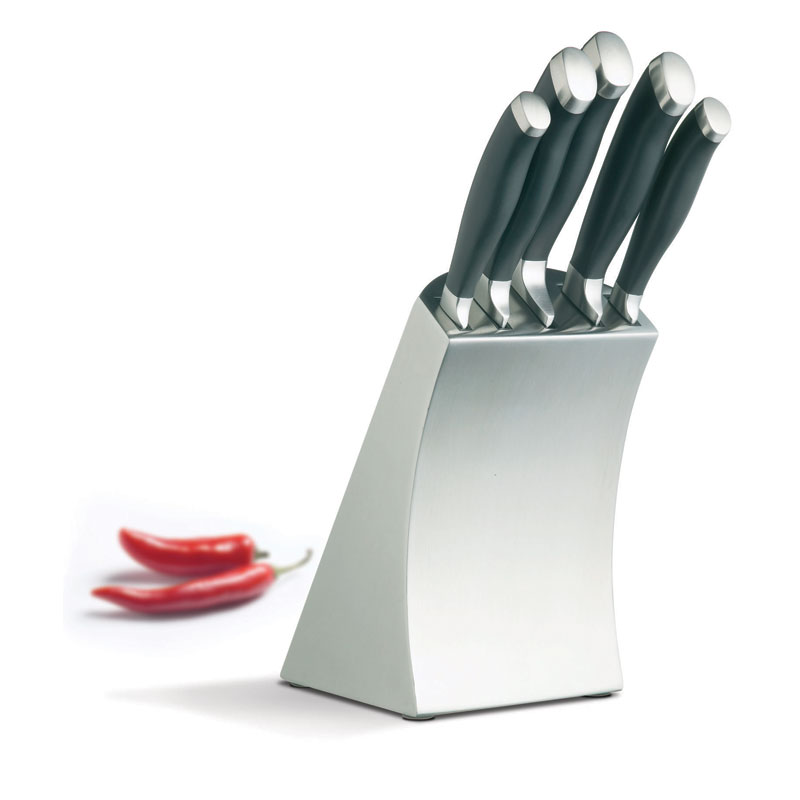 A készlet tartalma:- szakácskés 20 cm-es pengével;- kenyérvágó kés 20 cm-es pengével;- általános kés 12,5 cm-es pengével;- szeletelőkés 20 cm-es pengével;- hámozókés 8,5 cm-es pengével;- rozsdamentes acél késtartó.