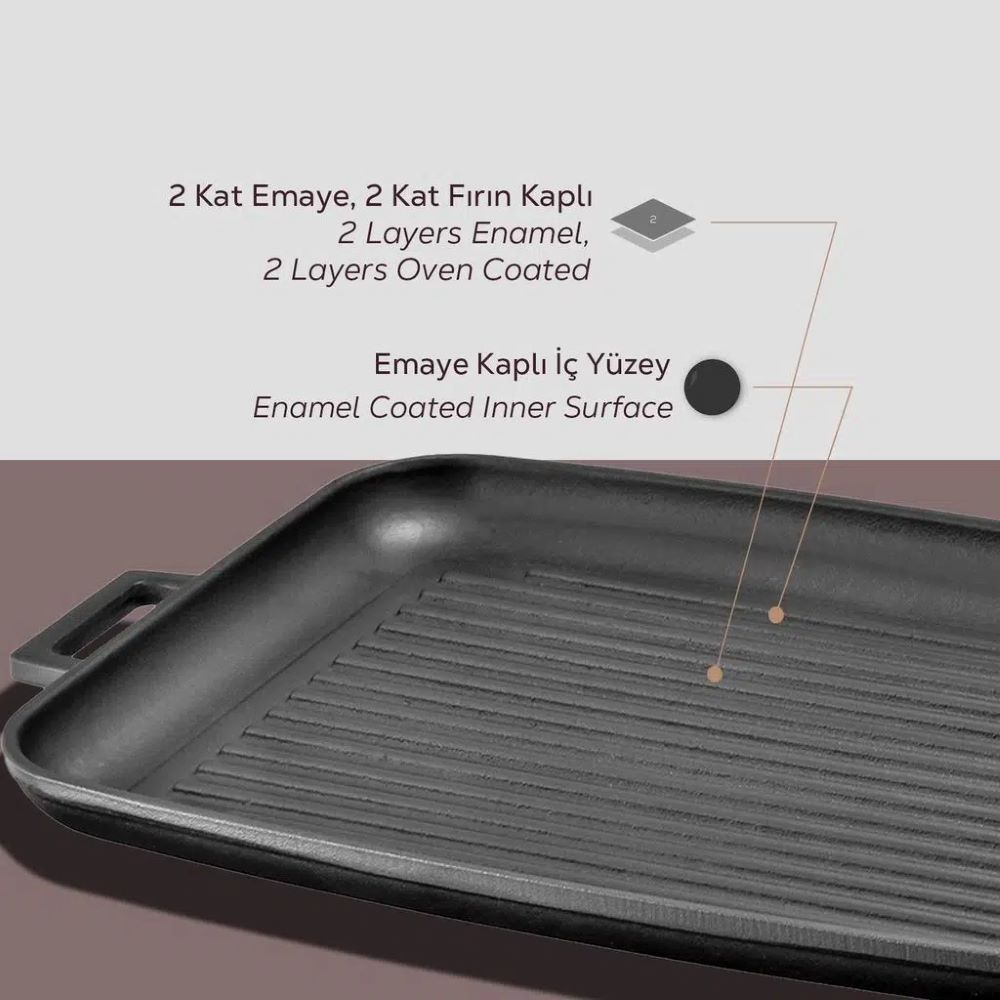 A tepsi falai 4 mm vastagok, belül pedig egy réteg fekete zománccal vannak bevonva, amely elősegíti a tapadásmentes felület kialakulását zsíros sütés esetén.