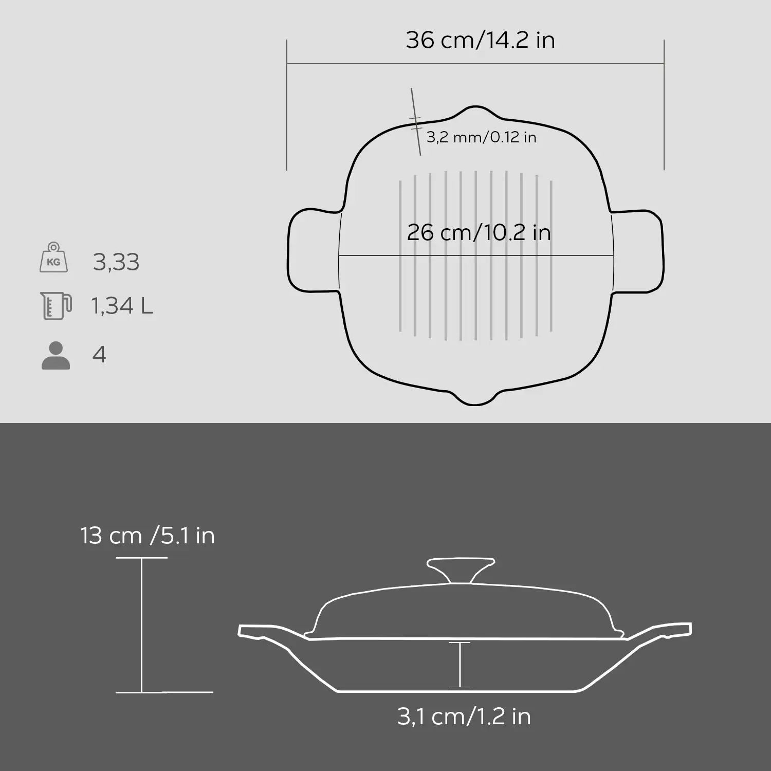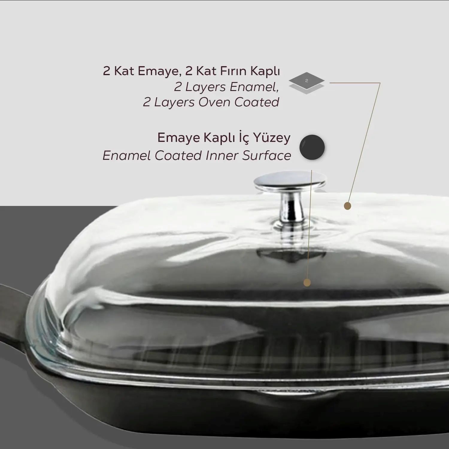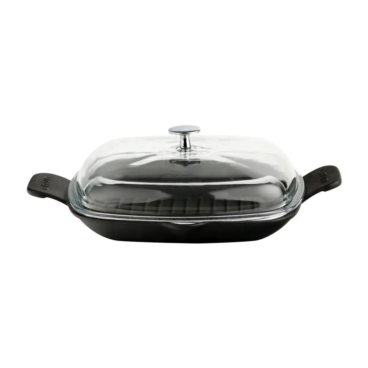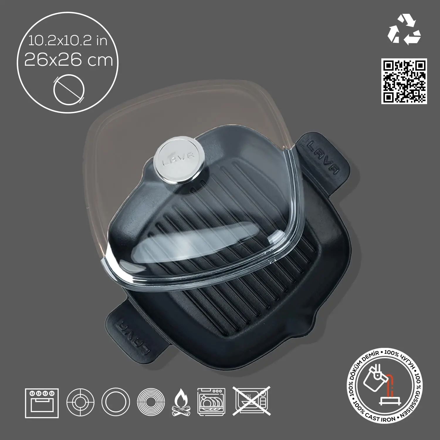 Lava szögletes Grill serpenyő, anyaga öntvény, méretei 26 x 26 cm. Hőálló üveg fedővel van ellátva.