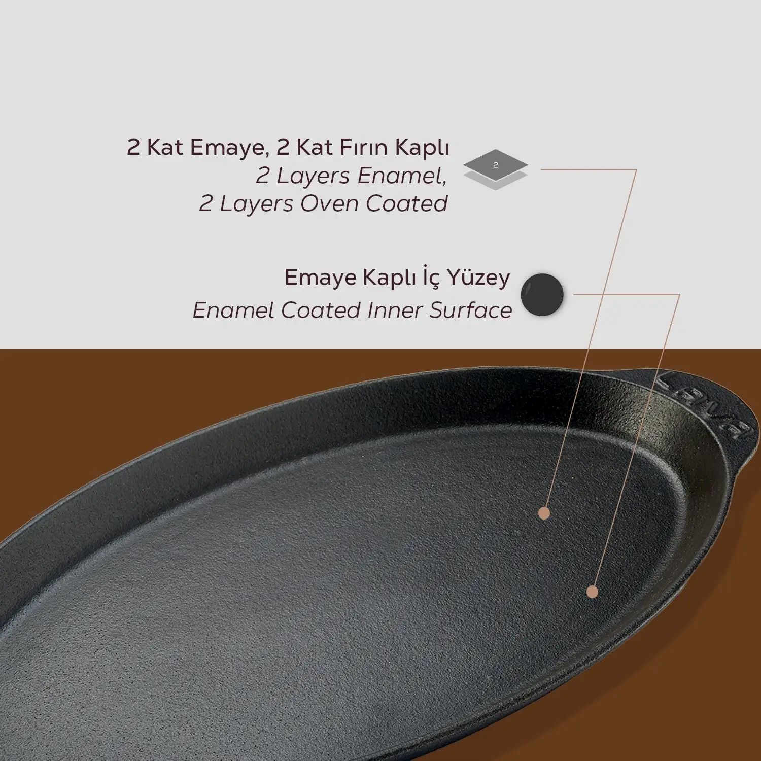 A halserpenyő falai 4 mm vastagok, belülről a terméket egy réteg fekete zománc bevonattal látták el, amely elősegíti a tapadásmentes felület kialakulását zsíros főzéskor.