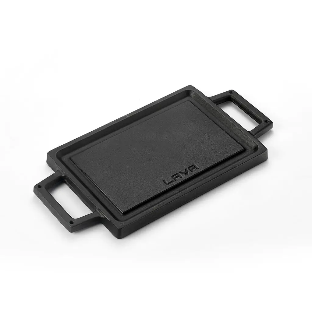 Megfordítható grillsütő, öntöttvasból, Lava márkájú. A termék egyik oldalán grillsütővel, a másik oldalán pedig főzőlappal van felszerelve.