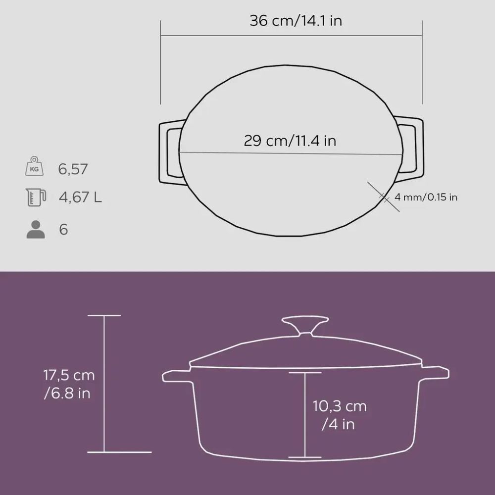 Lava ovális lábas, átmérője 29 cm, űrtartalma 4,67 l, anyaga öntvény.