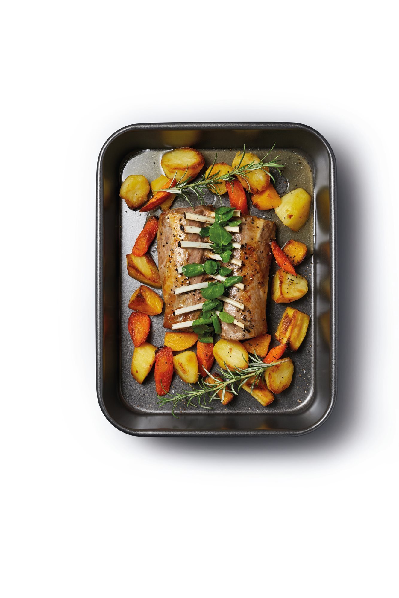 Mellette talál egy tapadásmentes tálcát, amely ideális sós ételekhez, mint például: lasagne gazdag mártással, gratinos tészta, moussaka, steak vagy sós sajtos pite.