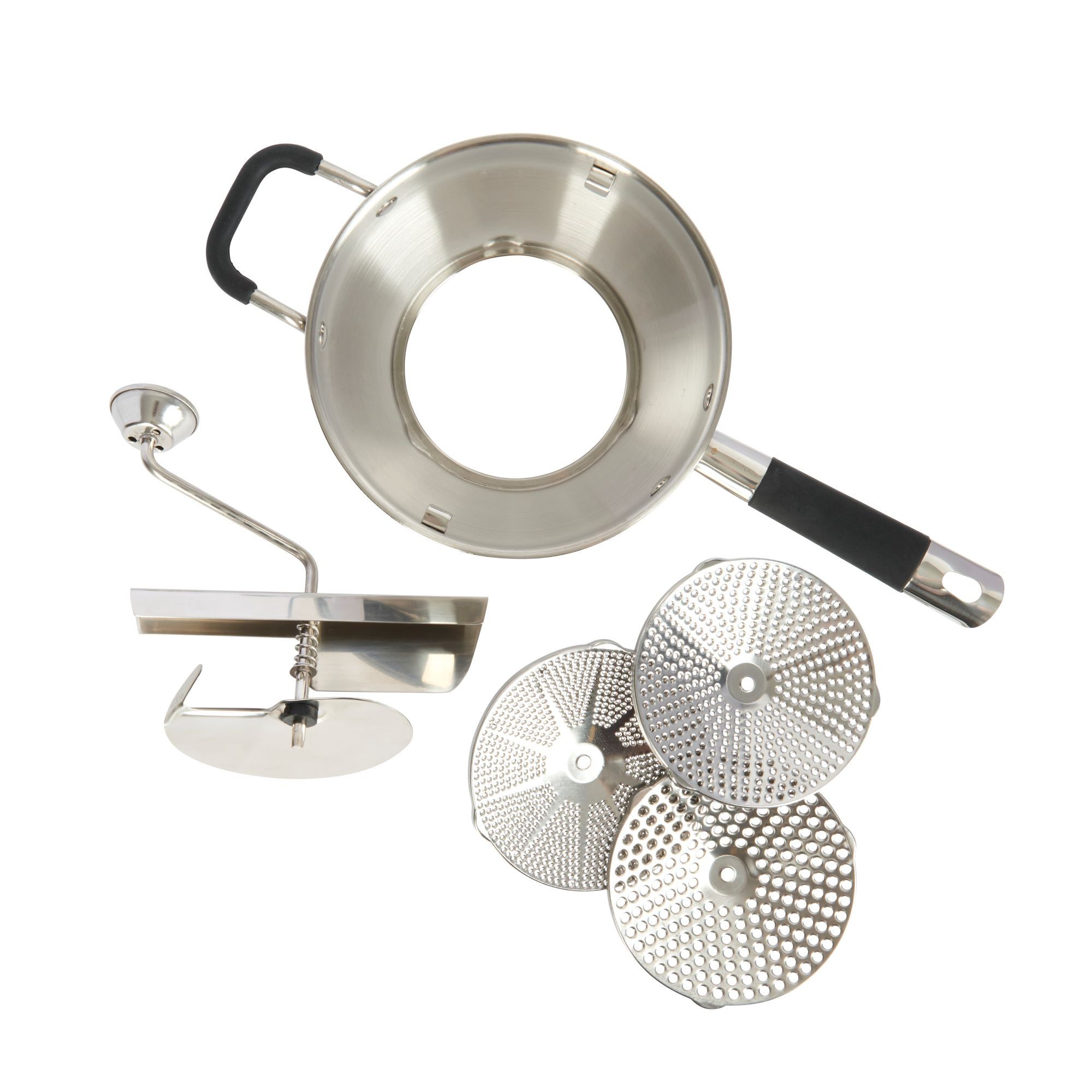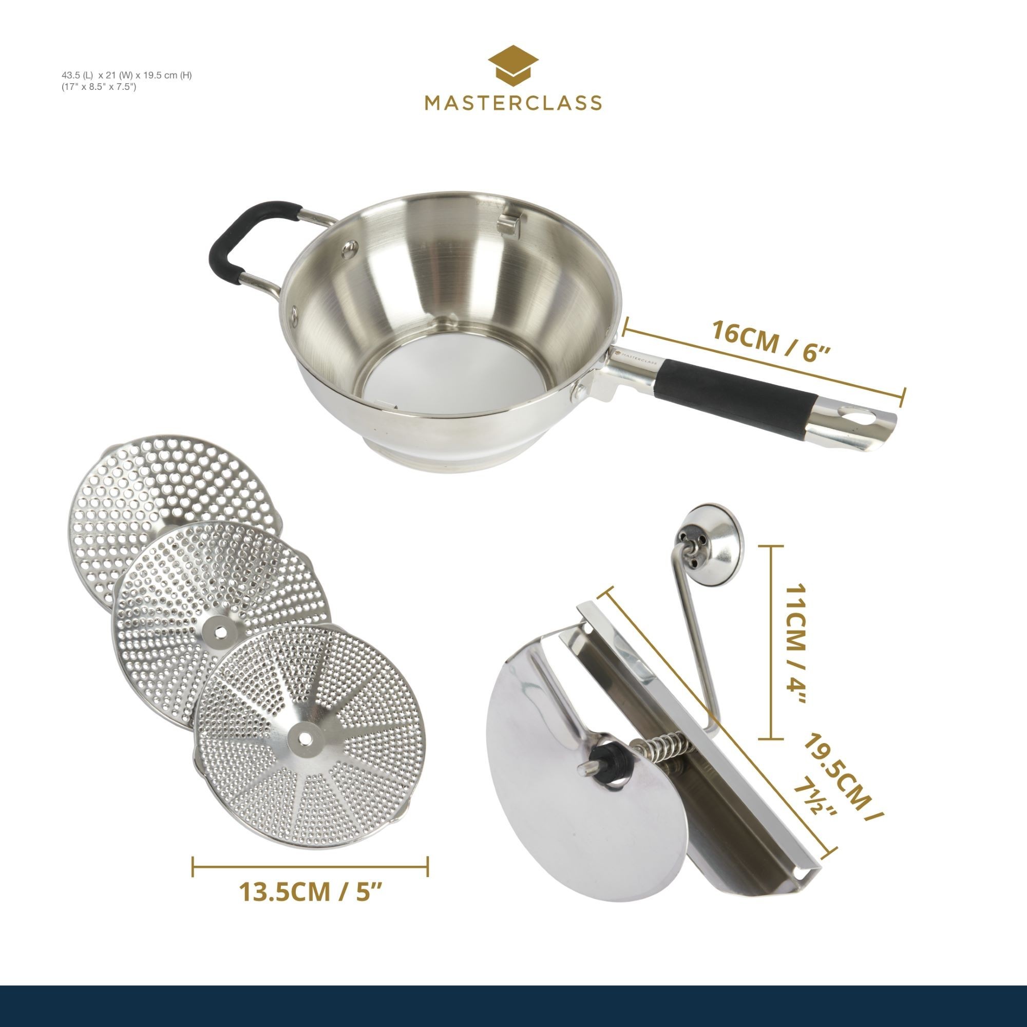 MasterClass márkájú passzírozó, 3 db. szitával, méretei 42,5 x 21 x 10 cm, rozsdamentes acélból készült.