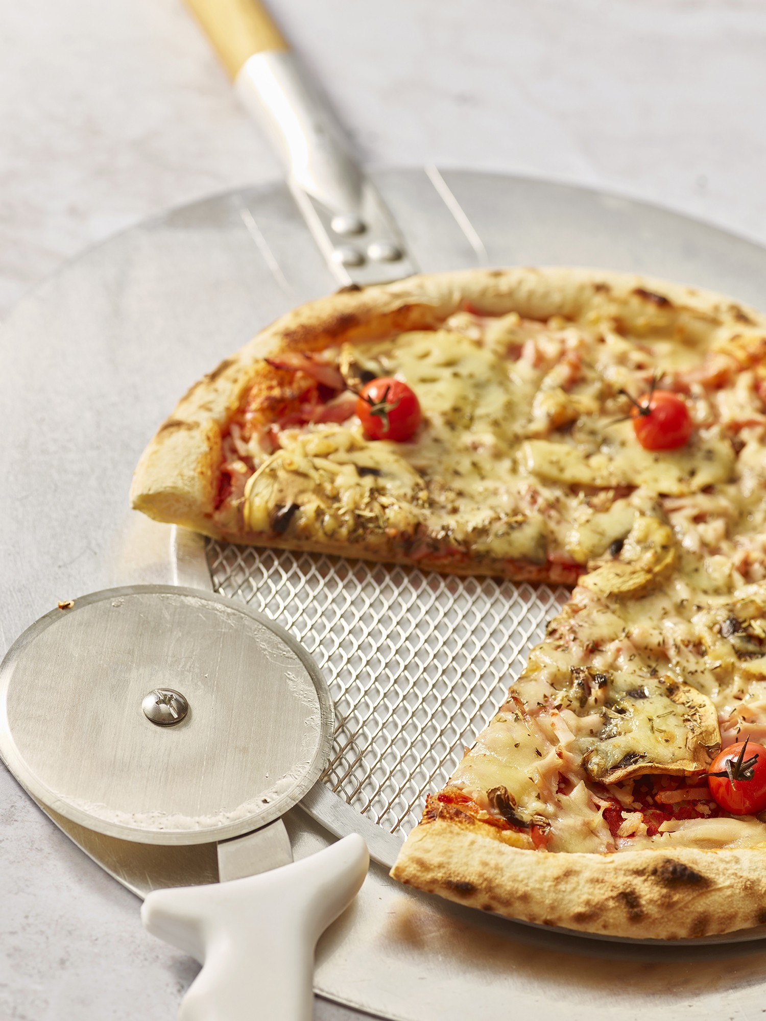 A serpenyő felülete úgy van tervezve, hogy megkönnyítse a pizza kezelését egy pizzahéj segítségével.