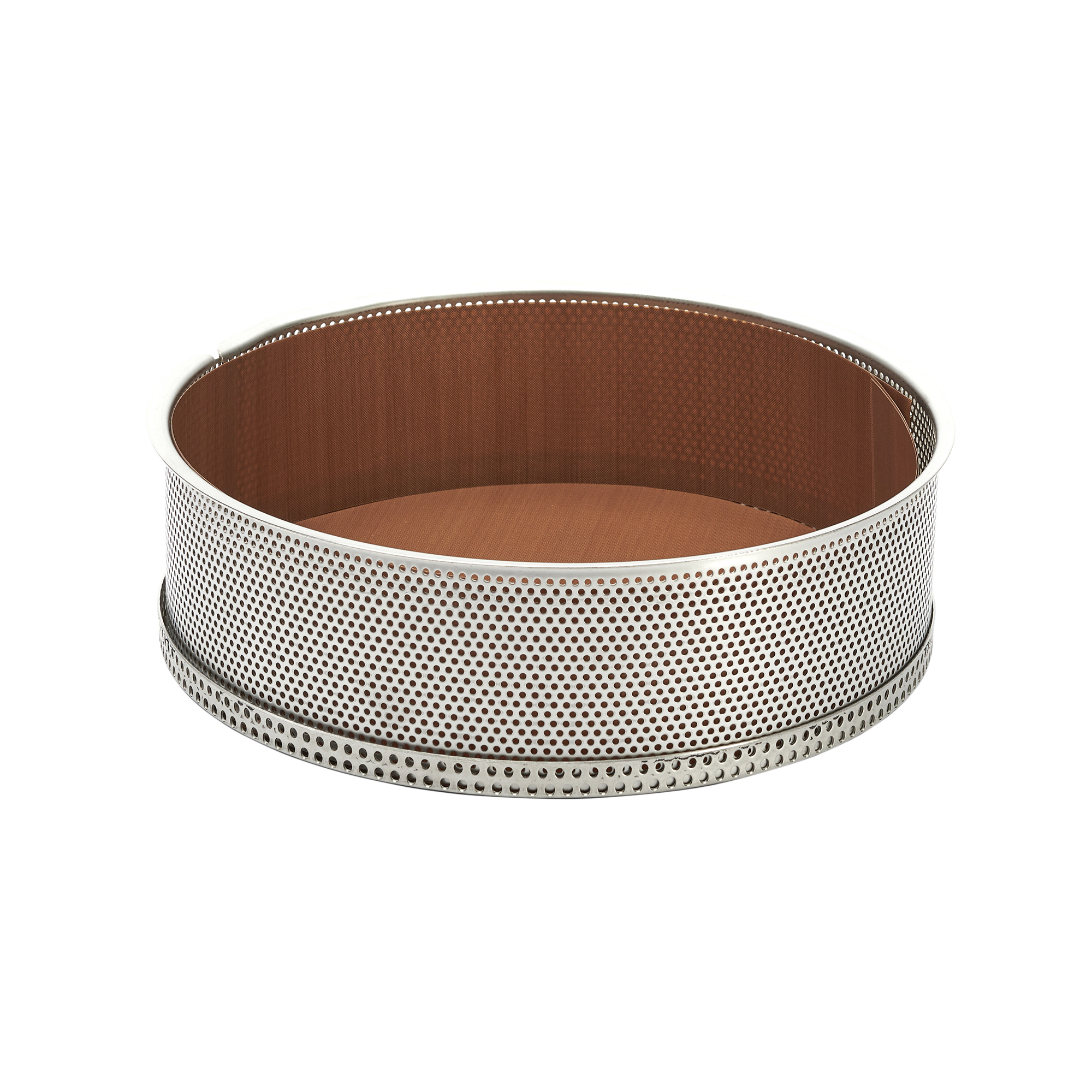 Kivehető aljú, perforált forma, rozsdamentes acélból, 24 cm átmérőjű, sütőpapírral együtt, de Buyer márkájú.