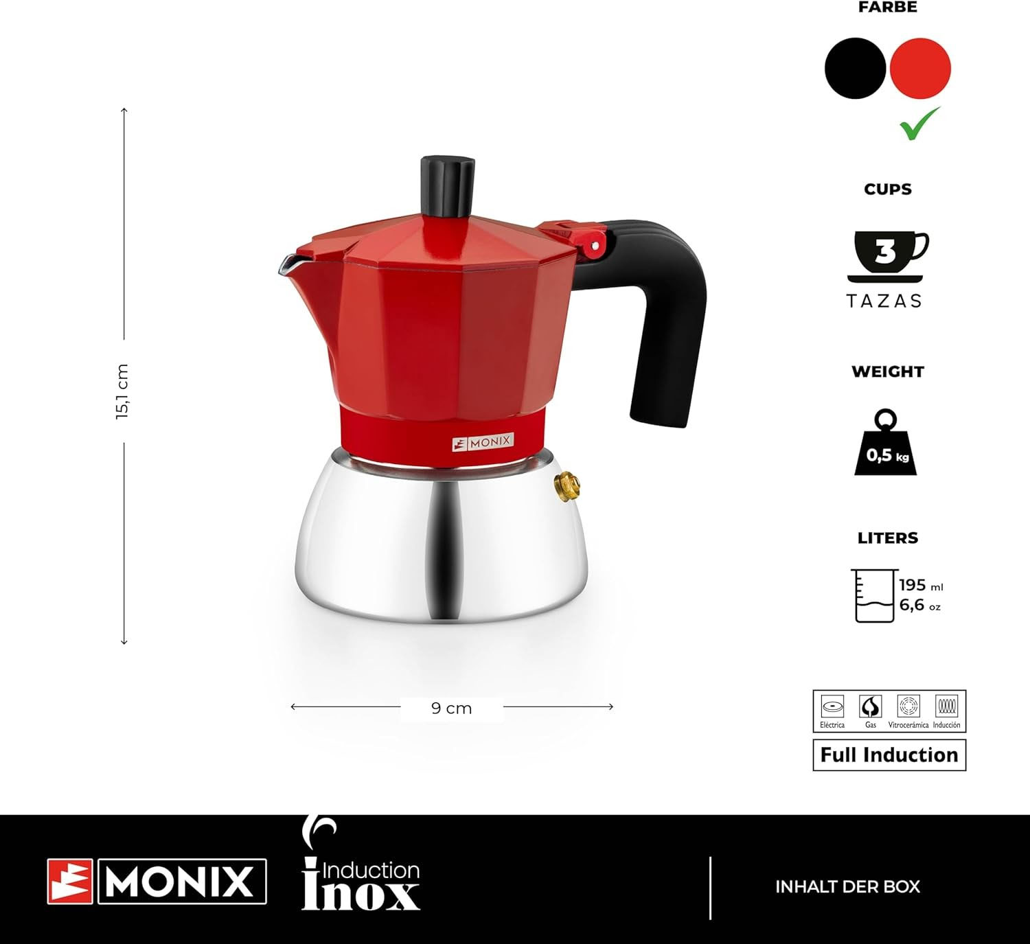 Indukciós talp átmérője: 9 cm (! használjon a kávéfőző alapjához hasonló vagy valamivel nagyobb átmérőjű indukciós zónát)