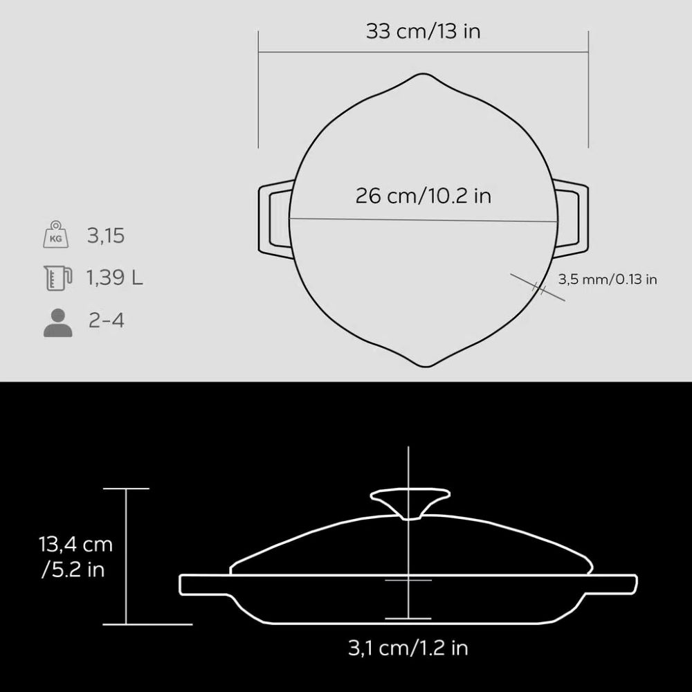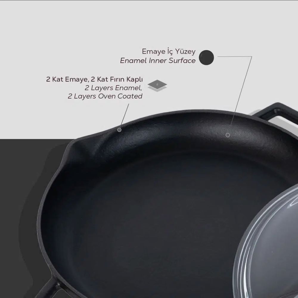Lava serpenyő fedővel, anyaga öntvény, átmérője 26. A fedő anyaga hőálló üveg.