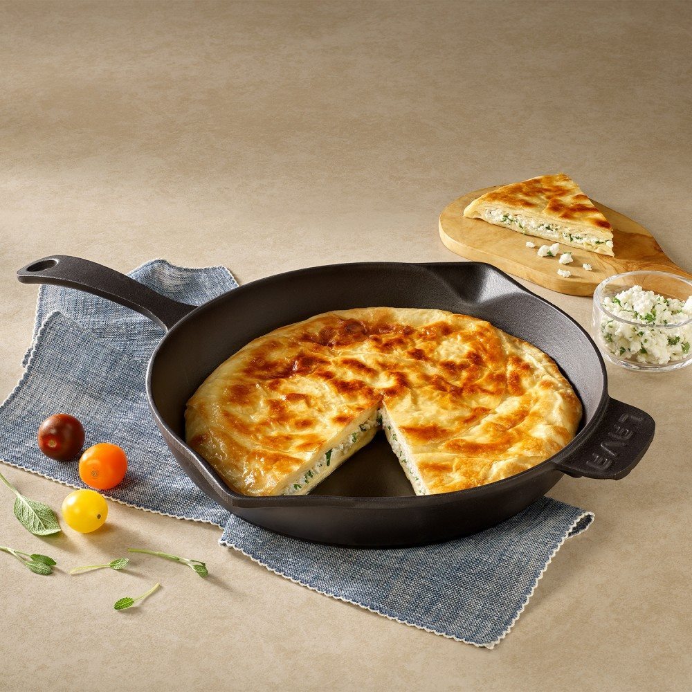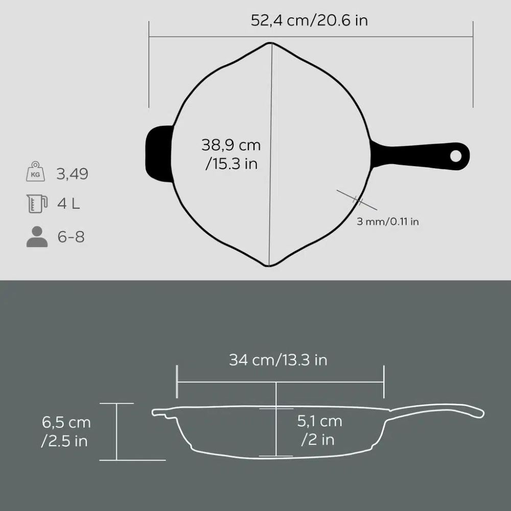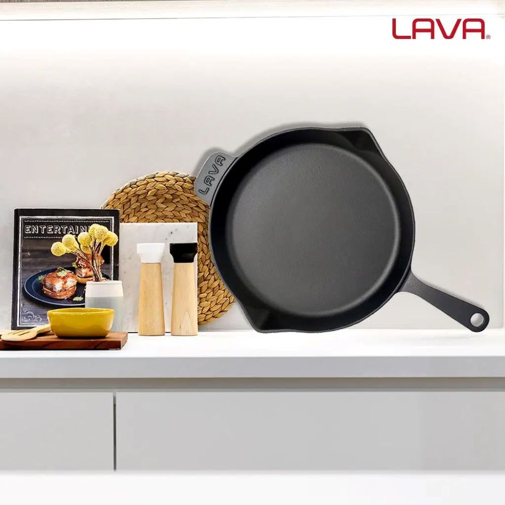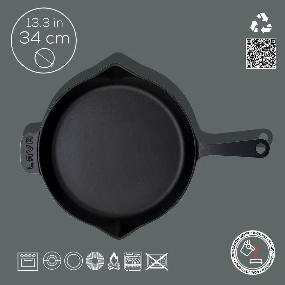 Kerek serpenyő, belső átmérő 34 cm, űrtartalom 4 l, öntöttvas, LAVA márka.