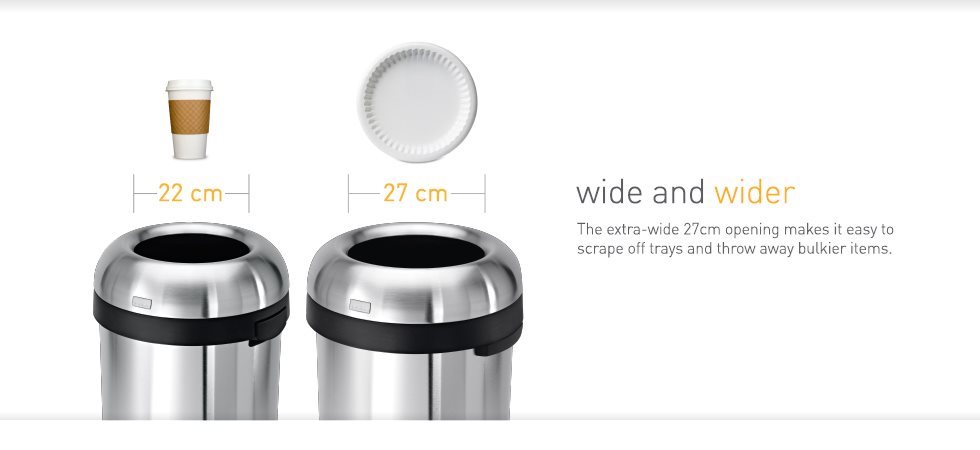 A szemetesnek nincs teteje, de van egy 27 cm-es nyílása amelyen keresztül az éttermi tálcákról gyorsan bedobható a szemét. Épp azért ideális kereskedelmi egységeknek, vendéglőknek és kávézóknak.