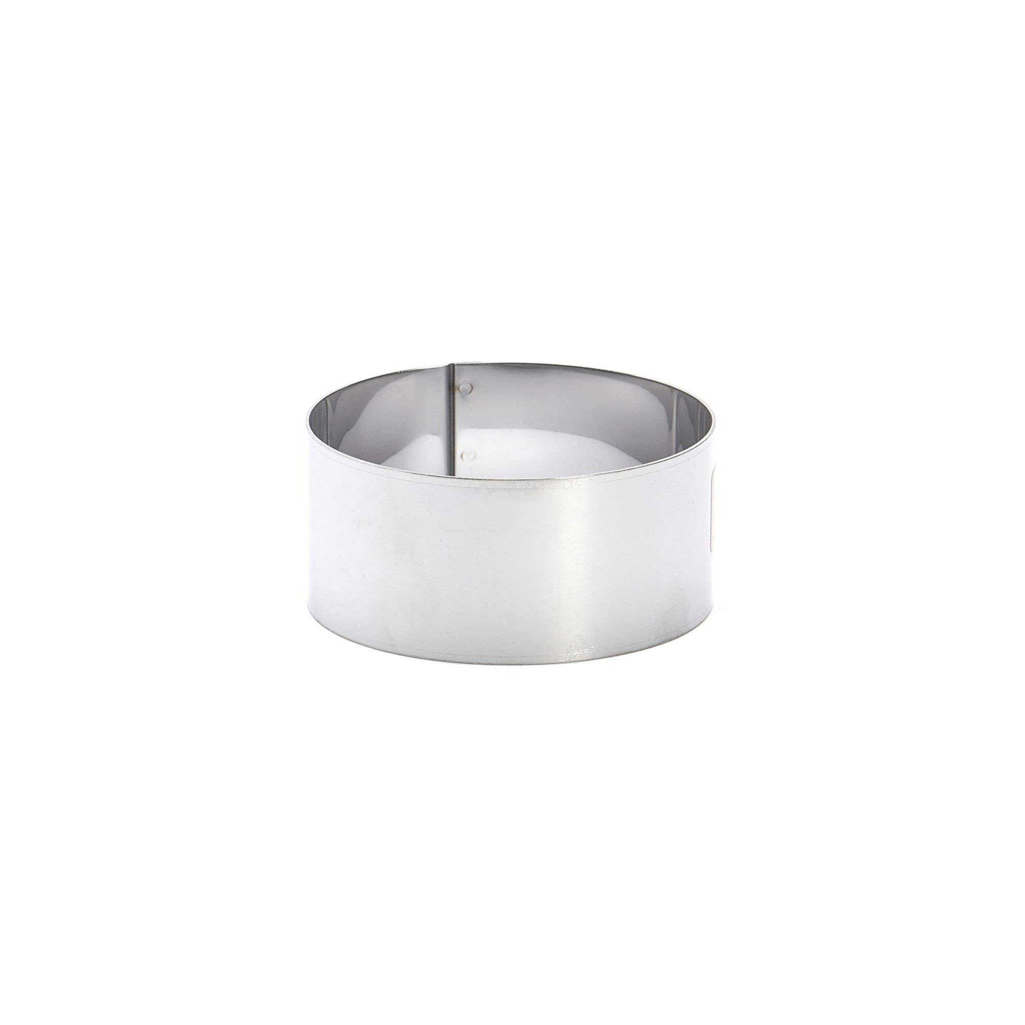 Kerek pékstagyűrű egyenes szélekkel, 4,5 cm magas és 12 cm átmérőjű, rozsdamentes acélból, ideális desszertek összeszereléséhez és hideg formázáshoz, de Buyer.