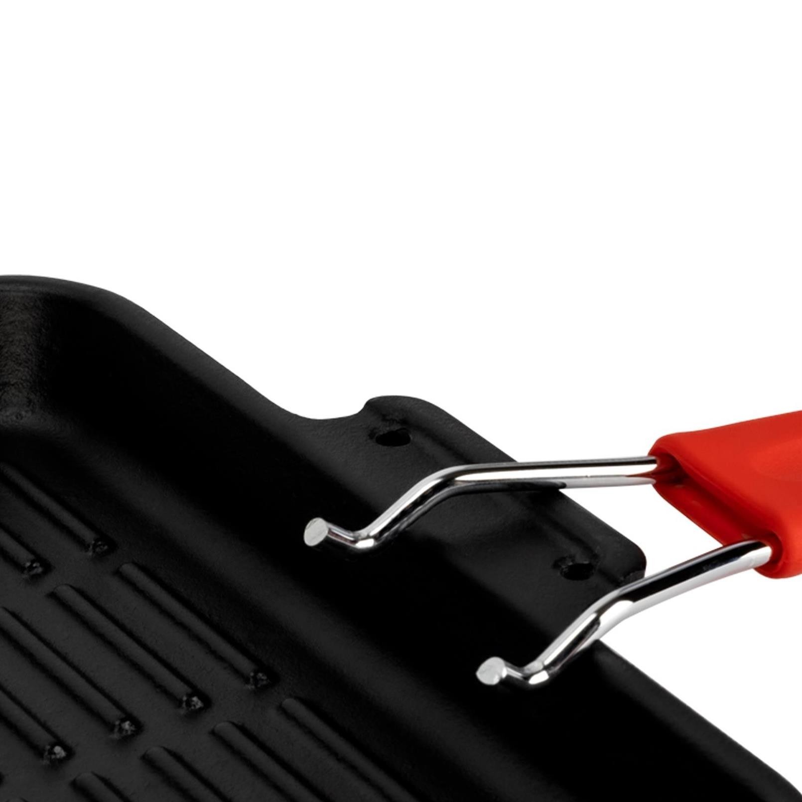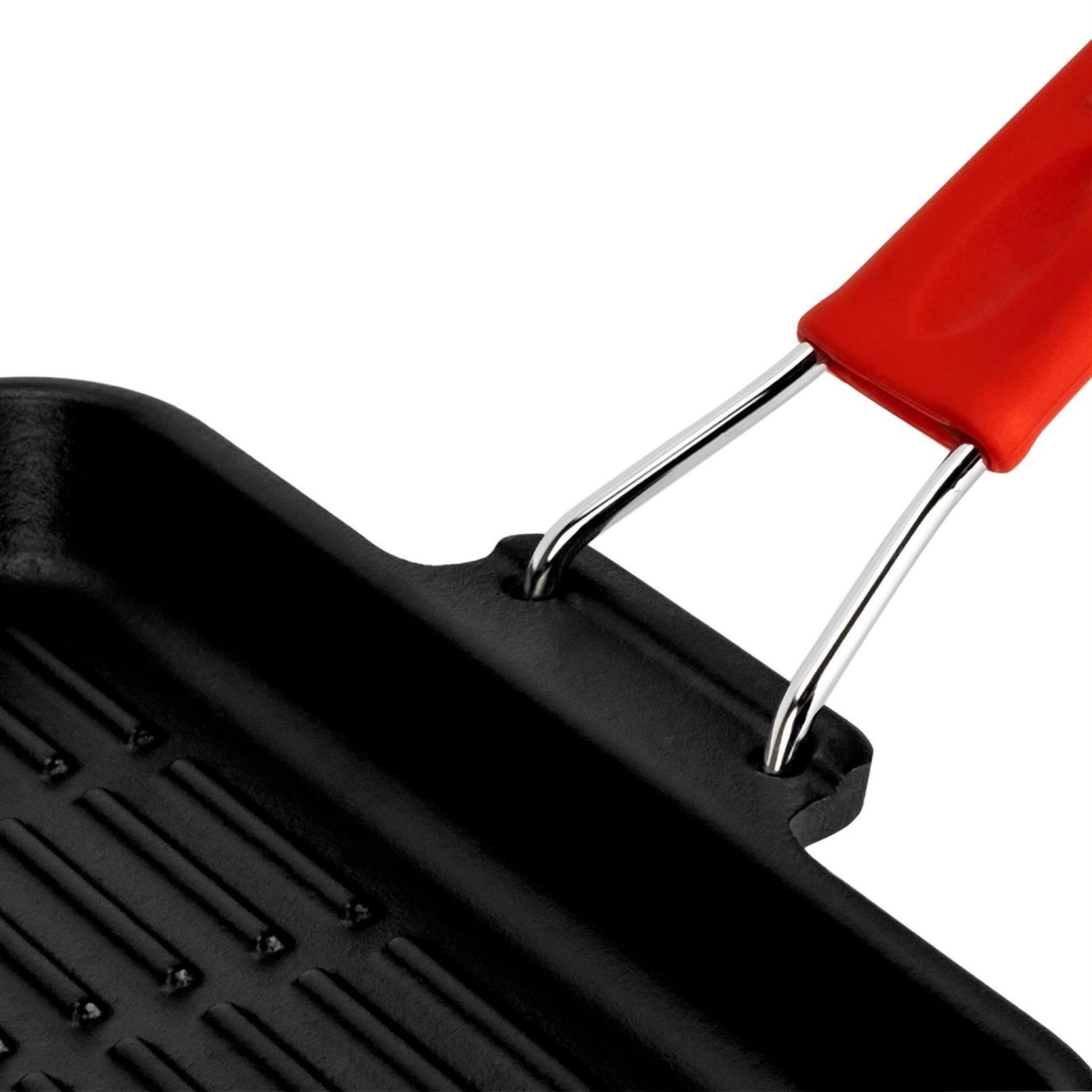 A fogantyú rozsdamentes acélból készült, piros szilikon bevonattal.