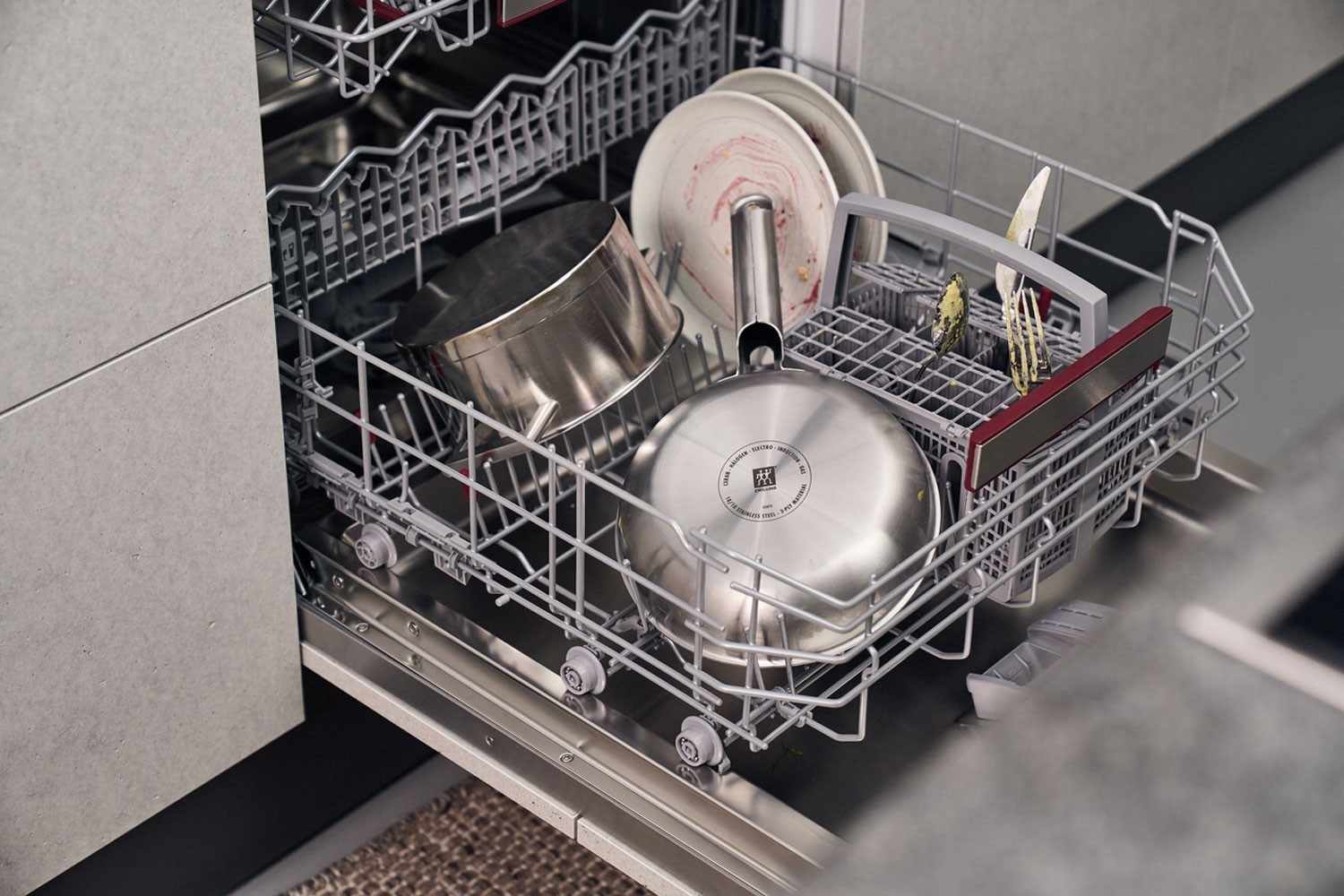 A serpenyőben használt kiváló minőségű 18/10-es rozsdamentes acél különösen higiénikus, robusztus és karcálló.