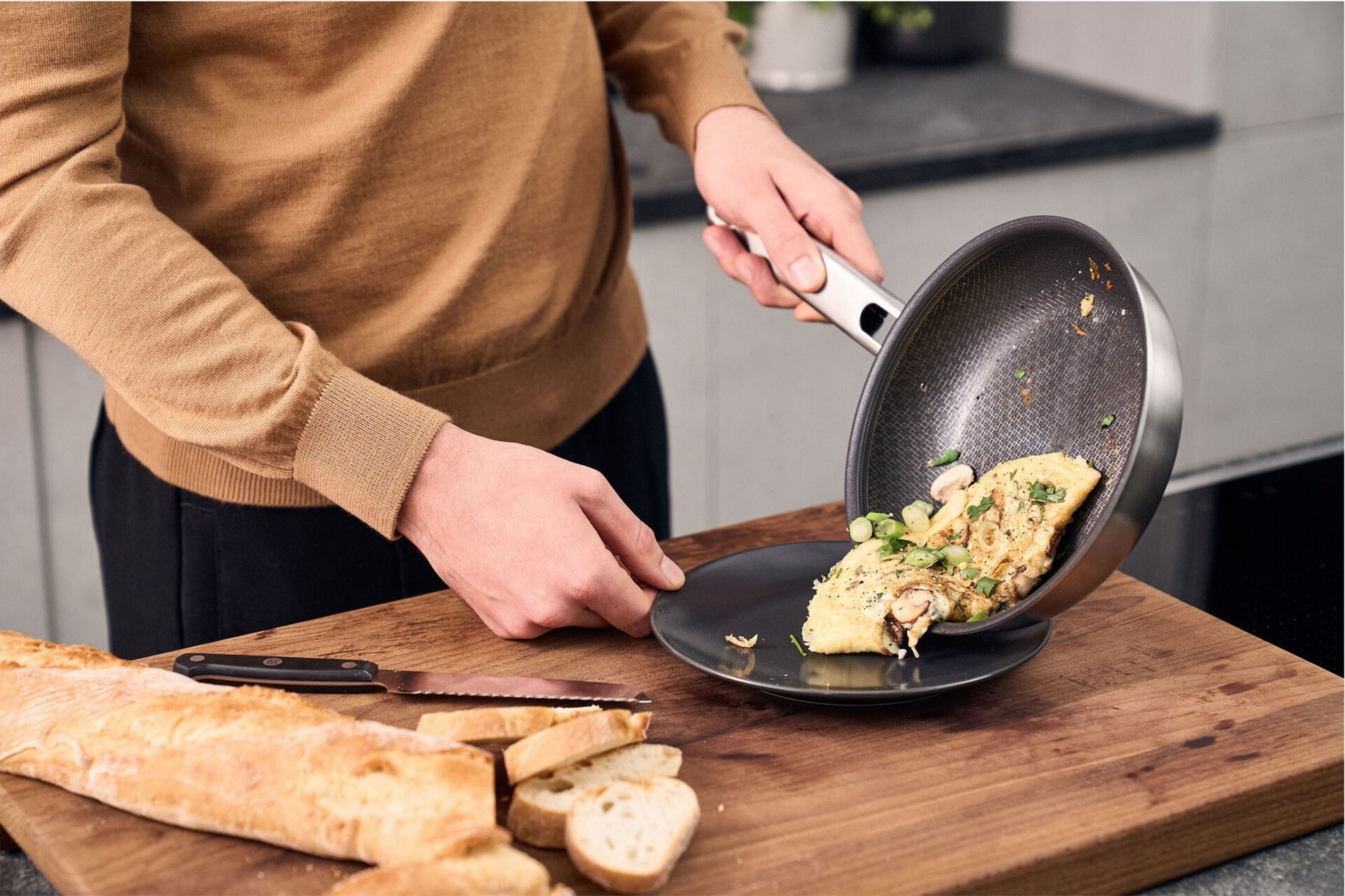 A ZWILLING Joy Plus serpenyő ötvözi a tapadásmentes bevonatú serpenyők és a tapadásmentesek tulajdonságait. A serpenyő alkalmas mind a finom sütéshez, mind az intenzív pirításhoz. A hal, a tojás és a zöldségek könnyedén elkészíthetők ebben a serpenyőben.