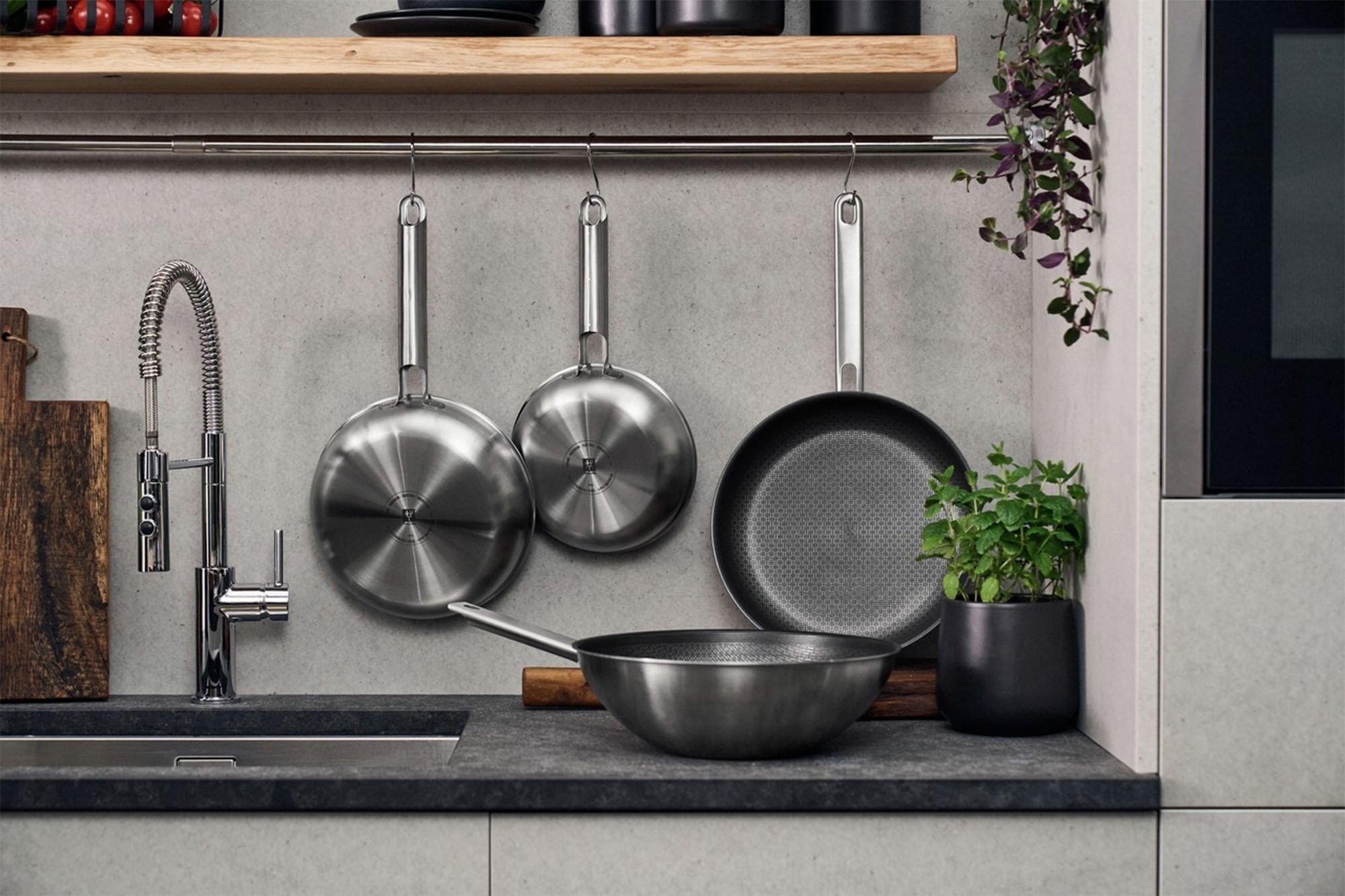 A serpenyőben használt kiváló minőségű 18/10-es rozsdamentes acél különösen higiénikus, robusztus és karcálló.