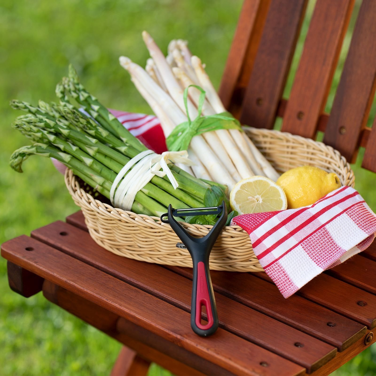 Zöldség- és spárgahámozó, amelyet a Westmark gyárt, műanyagból , rozsdamentes acél pengével.