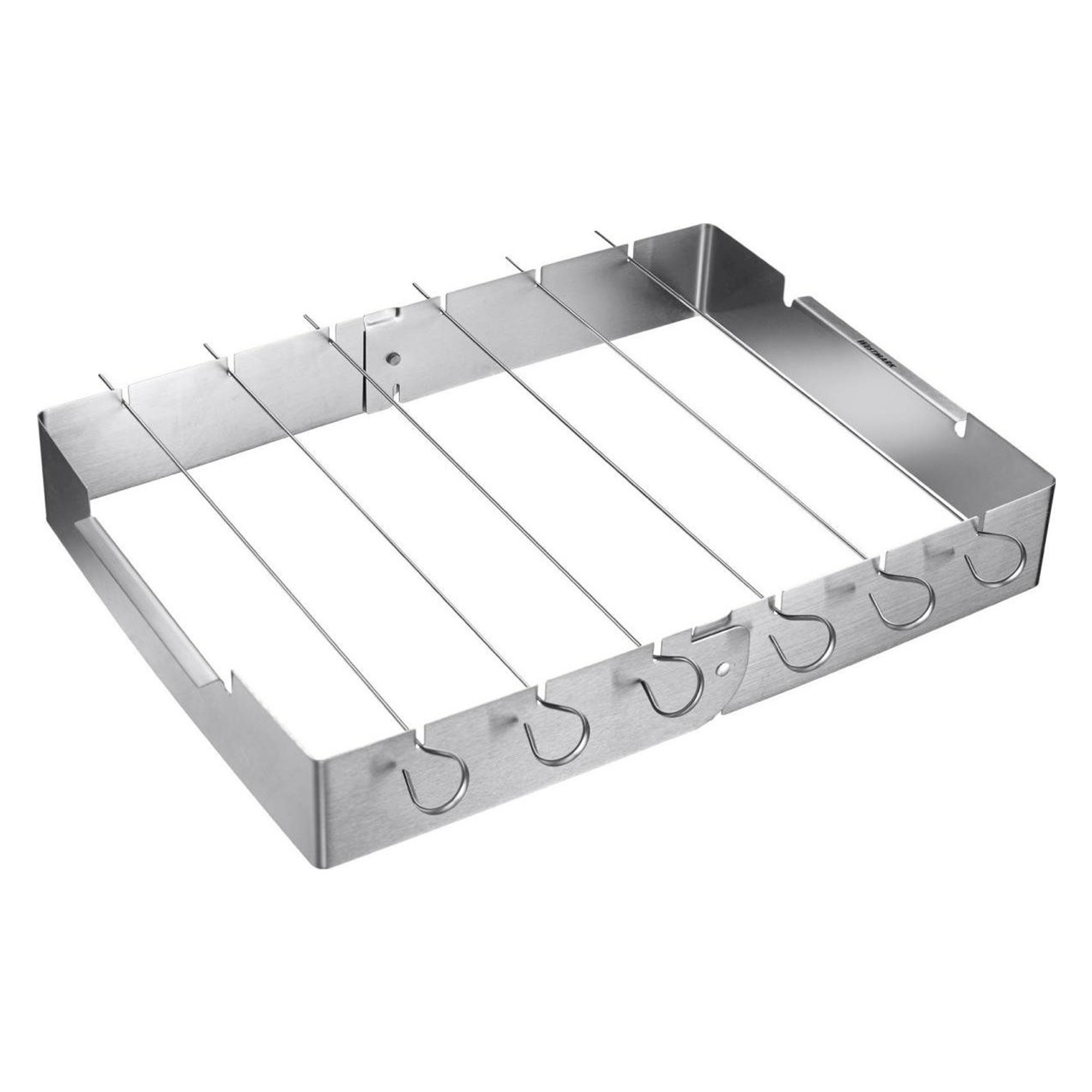 Az állvány lehetővé teszi a nyársak könnyű forgatását, így minden oldalról egyenletesen süthetők. A csúszás megakadályozása érdekében az állványon speciális nyílások találhatók a nyársak behelyezéséhez.