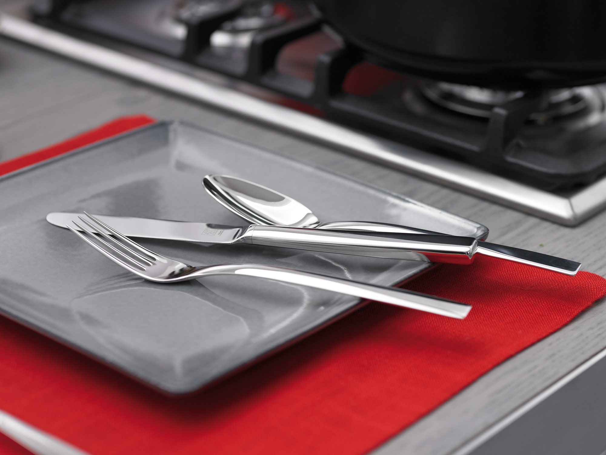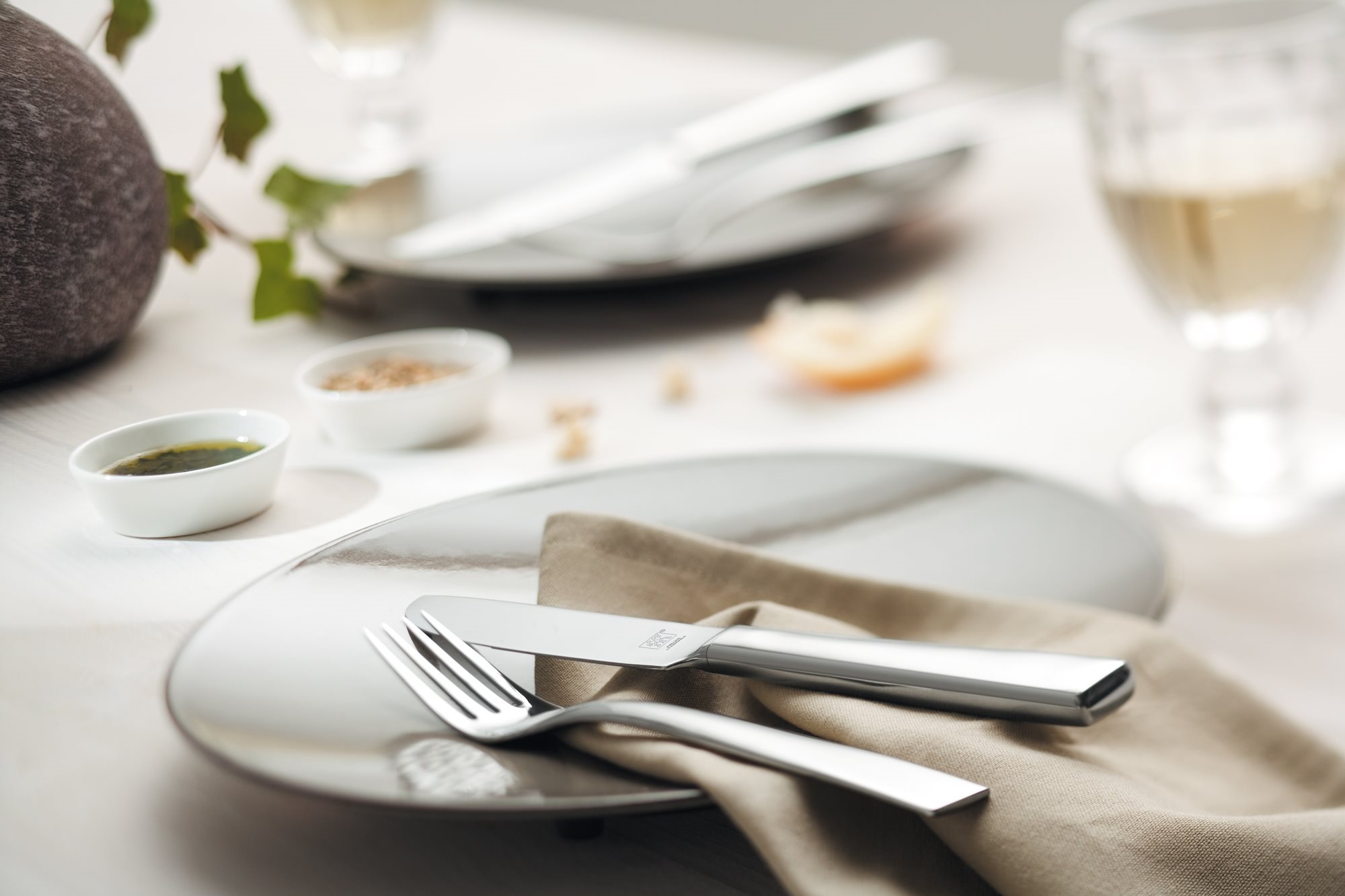 Asztali kés, Zwilling, 18/10 rozsdamentes acélból. Jellemzői az egyenes és finoman lekerekített vonalak kombinációjából származó formák.
